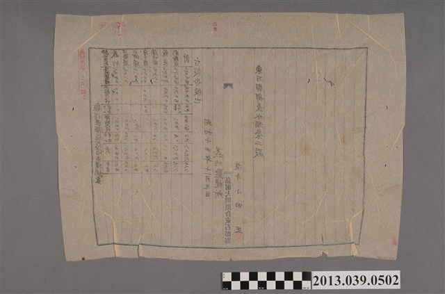 1. 本件為義竹灌溉監視所技手小田正,於昭和14年(1939)11月9日,提交給嘉南大圳東石郡部長水溜榮二郎的雜作區的陸稻栽培面積調查表,公文文號為義竹灌第386號。2. 義竹灌溉監視所管轄的給水區有:義竹、北勢堀、三腳猫、埤子頭、頭竹圍、新店、南新店。3. 表單欄位如下:給水區名、灌溉地面積、水稻作付(種植)、仝上歩合、陸稻作付、仝上歩合、計、歩合。(曾祥宇、曾明德撰寫)