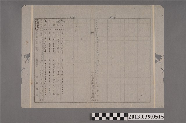 1. 本件為〈鐵線橋分線ノ二堤防並浚渫補修工事 利迴ノ觀念二基キ算出シタル土地價格表 新營郡部〉,為嘉南大圳組合新營郡部修補查畝營分線時,基於複利概念計算之土地價格表。2. 調查時間不明,地點為竹圍子、下角帶圍、番子厝。依據內容推測,與館藏2013.039.0454、0455、0459、0460、0461、0462、0463、0466、0467、0478、0518有關,為新營郡部於昭和14年(1939)土地補償調查下的一環。3. 欄位分別為:郡庄、地目、等級/等則、小作料、公課(分為地租、附加稅、農會、水租、土地整理組合費)、公課扣除小作料、利廻(語意為平均報酬率,數字為小數點以下)一甲當買賣價格。(曾祥宇、曾明德撰寫)