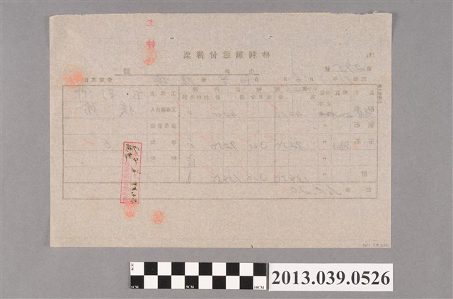 1.此件為「砂利類送付傳票」,編號第295號,記錄昭和17年(1942年)3月6日自白芒至港墘之礫石運送情形,為當時台南州(今嘉義縣)之範圍。2.根據命令第26號(臺史博館藏登錄號:2013.039.0548),共需輸送形質2分至3寸的混合砂利42立坪,以及形質8寸以上的玉石92.5立坪,共計134.5立坪。此傳票當日輸送了形質8寸以上的玉石3立坪,分6車載送,送付未濟一欄寫有「完了」,應是指該命令所需之所有砂利類已全數輸送完畢。(立坪為體積單位,1立方公尺約為0.166375立坪)3.本傳票係於昭和17年4月24日核對記錄。傳票上有主幹福林、作業主任古木、檢查調書照合濟廣山等核章。4.記事一欄寫有NO.20之鉛筆字樣。(曾祥宇、莊竣雅撰寫)