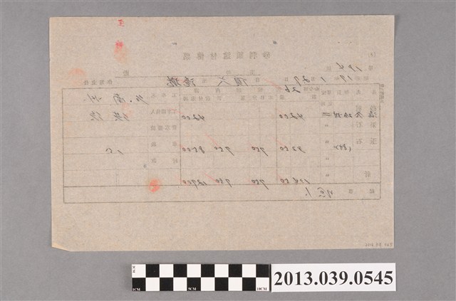 1.此件為「砂利類送付傳票」,編號第194號,記錄昭和17年(1942年)1月27日自頂六至港墘之礫石運送情形,為當時台南州(今嘉義縣)之範圍。2.根據命令第26號(臺史博館藏登錄號:2013.039.0548),共需輸送形質2分至3寸的混合砂利42立坪,以及形質8寸以上的玉石92.5立坪,共計134.5立坪。此傳票當日輸送了形質8寸以上的玉石7.5立坪,分15車載送,累計已輸送7.5立坪,故送付未濟一欄中,形質8寸以上的玉石尚有85立坪未輸送。(立坪為體積單位,1立方公尺約為0.166375立坪)3.傳票上有主幹福林、作業主任古木等核章。4.記事一欄寫有NO.1之鉛筆字樣。(曾祥宇、莊竣雅撰寫)