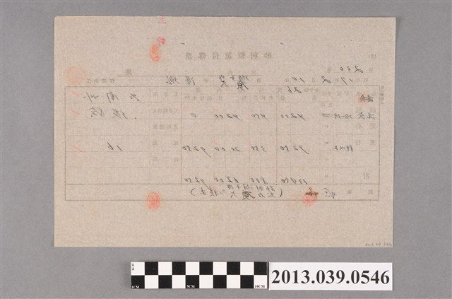 1.此件為「砂利類送付傳票」,編號第230號,記錄昭和17年(1942年)2月10日分別自湖子內、頂六至港墘之礫石運送情形,為當時台南州(今嘉義縣)之範圍。2.根據命令第26號(臺史博館藏登錄號:2013.039.0548),共需輸送形質2分至3寸的混合砂利42立坪,以及形質8寸以上的玉石92.5立坪,共計134.5立坪。此傳票當日自湖子內輸送了形質2分至3寸的混合砂利4.5立坪,分9車載送,累計已輸送42立坪,該命令所需之所有混合砂利已全數輸送完畢;形質8寸以上的玉石部分則是從頂六輸送了3.5立坪,分7車載送,累計已輸送20立坪,故送付未濟一欄中,形質8寸以上的玉石尚有72.5立坪未輸送。兩地輸送車數總計為16車。(立坪為體積單位,1立方公尺約為0.166375立坪)3.傳票上有主幹福林、作業主任古木等核章。4.記事一欄寫有NO.10,後來被劃掉改為NO.9之字樣。(曾祥宇、莊竣雅撰寫)