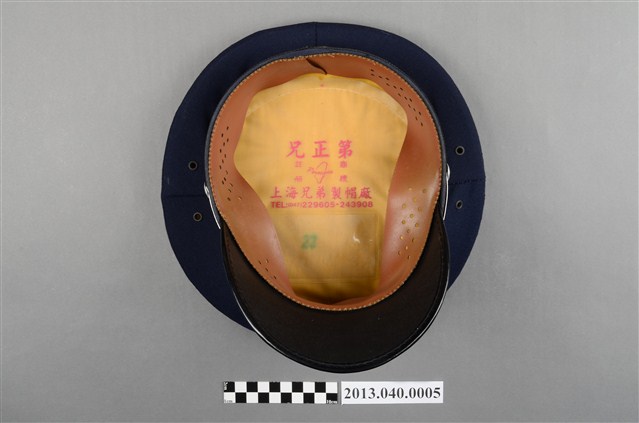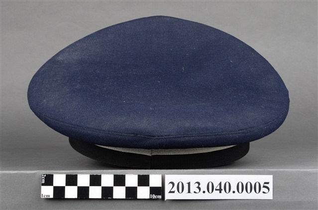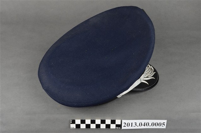 1. 本件為吳泰男先生擔任臺南縣義消之義消常服帽。帽式為棉質大盤帽,深藍色,正前方帽徽以黑色盾形為地,上加青天白日徽、金黃色警鴿、嘉禾穗之警徽標誌,青天白日徽左右各有一「義消」紅色刺繡字。帽牆為黑色底上加3條銀線。帽簷為深藍色布面底,上加三條銀色嘉禾穗,帽絆為一素面銀色帶。