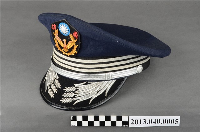 2. 本件帽徽仍沿用警鴿標誌,推測為1995年消防署成立以前之警消制服,帽牆三線銀線與帽簷三線穗,推測高階人員所配戴。
