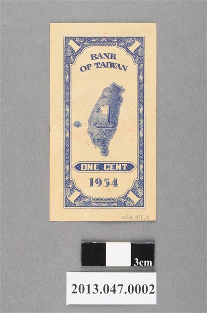 1. 此2件壹分券紙鈔為民國四十三年由中央印製廠台北廠印製。紙鈔採直式配置,正反面均為靛藍色系,正面中央為臺灣銀行總行圖案,上部署名「臺灣銀行」,並題中文字體面額、發行時間、印製地點以及「每拾分兌壹角」字樣,背面則為臺灣及澎湖島圖,並題英文字體面額、印製西元年份及臺銀英文名稱,紙鈔編號為AH742794、AH185814。