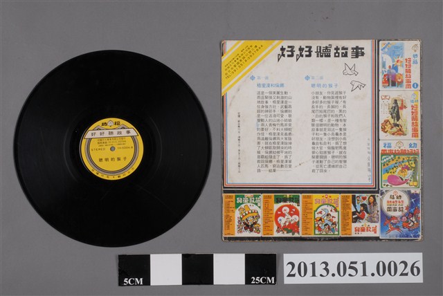 幼福文化事業有限公司出品編號「YH-5004」《好好聽故事 格里漢和倫娜》,內容包含「格里漢和倫娜」與「聰明的猴子」兩則童話故事。唱片封套背面署有「六年四班余盛揚24號」字樣。