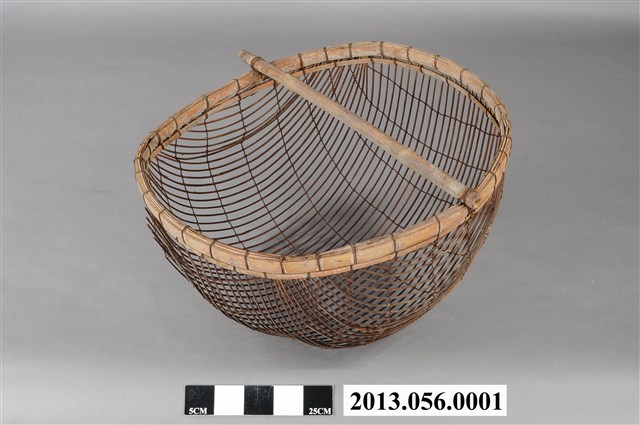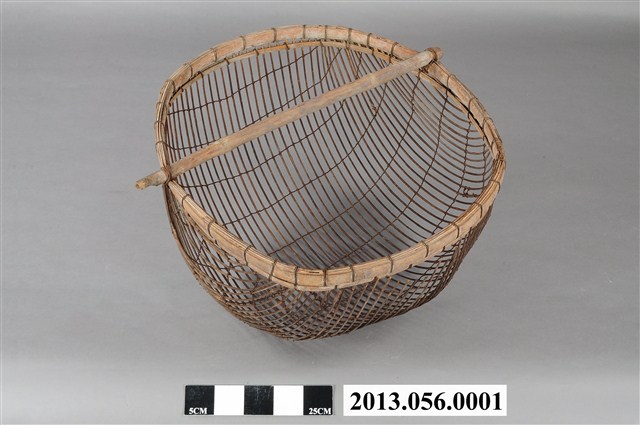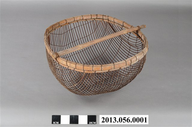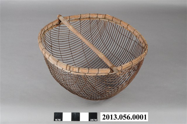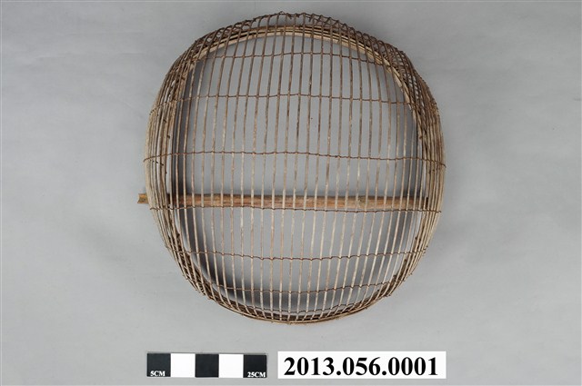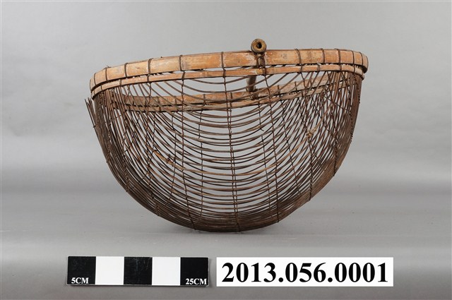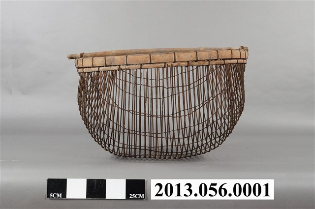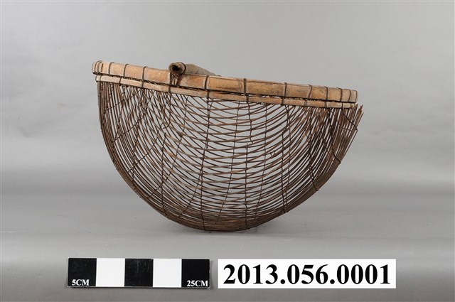 半圓型魚苗篩網,為王家早期從事養殖魚塭魚苗工作所有,用來篩選魚苗大小,以便分類販售,或是分類隔離養殖。此篩籃以鐵絲和削細的圓竹條塑成半圓,最後再用竹蔑圈固定收口。篩網細縫為長條狀,並有不同大小的篩選器,可提供魚民依據不同的需求使用,此篩籃孔為較小的,是用來篩選較為小隻魚苗所用,現今多以金屬或塑膠材質取代。據捐贈者王先生描述,此物件應該有近70年的歷史,推測應該是戰後初期的物品。