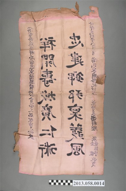 此物件為民國56年3月,游氏家廟祭祀公業董事長游祥鏗代表祭祀公業全體,贈送游祥忠當選宜蘭縣醫師公會理事之賀聯。此物件可瞭解宜蘭地區游氏家族的社會往來,並可與宜蘭縣的醫藥活動及相關人員,可參考館內藏品2013.058.0003作一初步脈絡性的觀察研究。