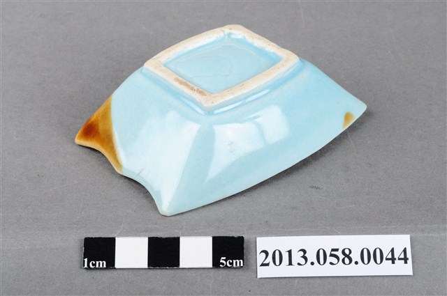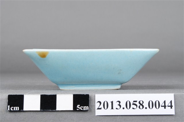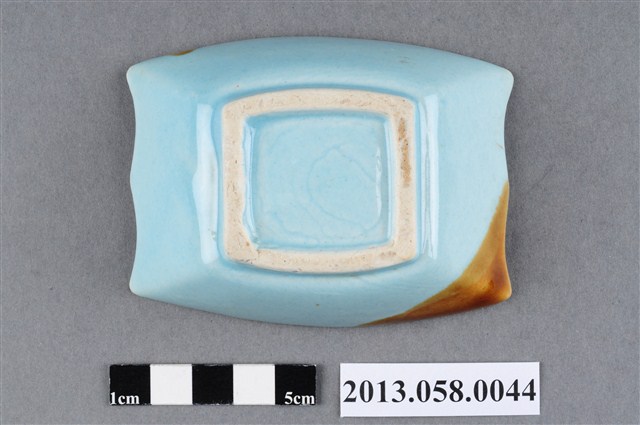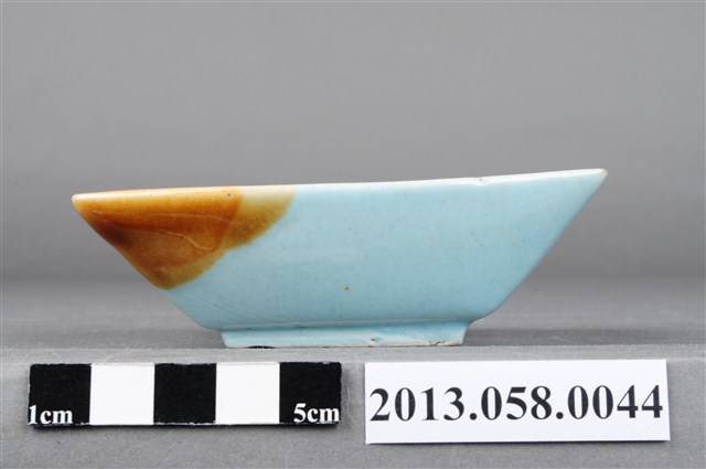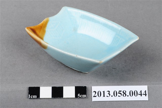 本件藍釉雙色壓花回紋碟,先施以利用淡藍色的釉彩之後,再施以部分深棕色的釉料,作為裝飾,而碟子內部利用壓花製成回紋,整個碟型為船型,此種釉彩的施作方式,曾經流行於製作飯碗,俗稱「淡青仔碗」,原來這種淡青仔碗主要是以蘋果的綠色為準,但因有人無法燒製出這種綠色,只能稍出藍色與咖啡色,因此本件應是屬於淡青仔碗系列中的一種。