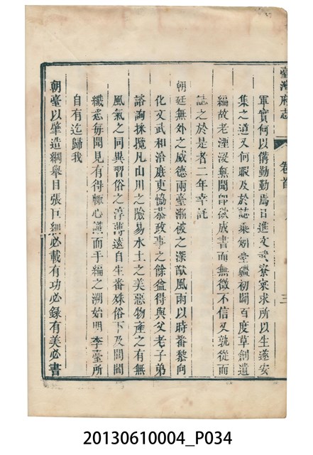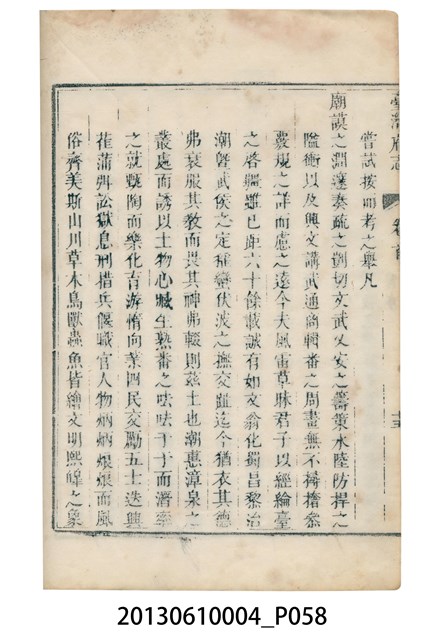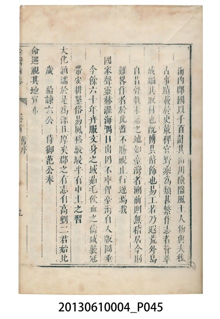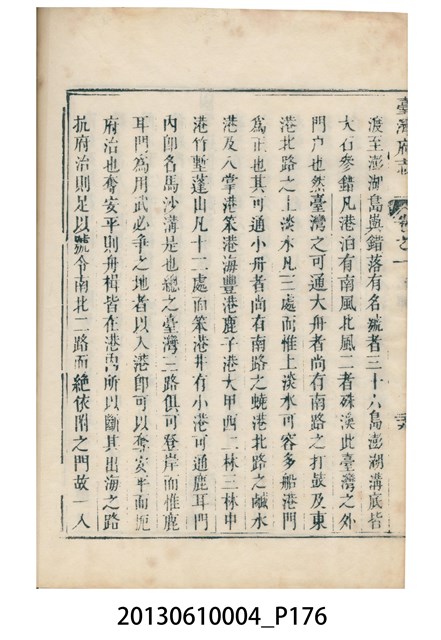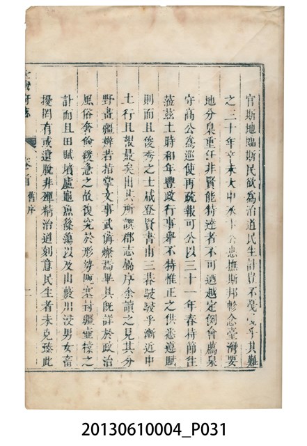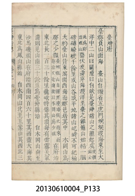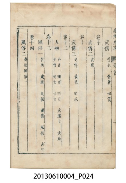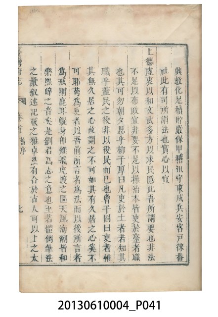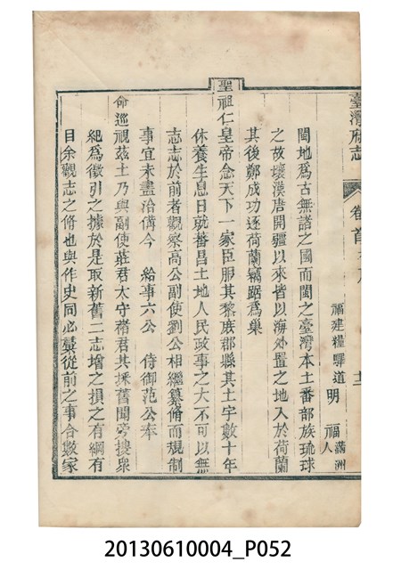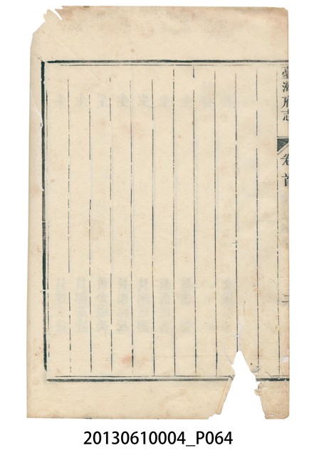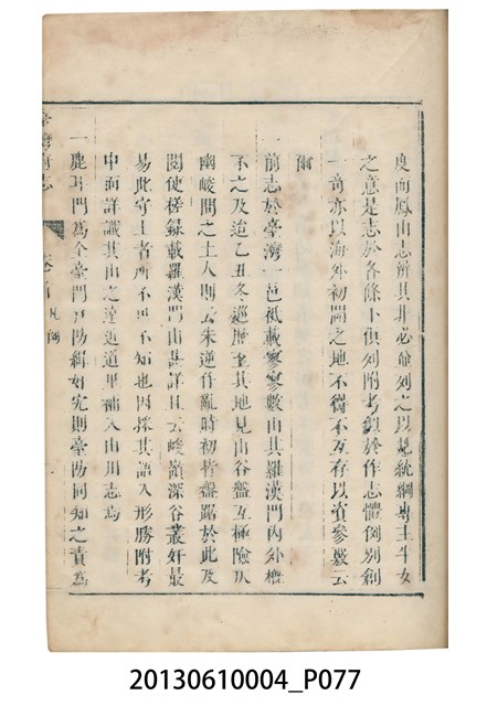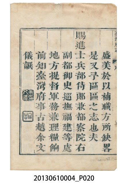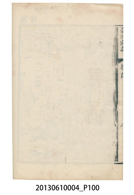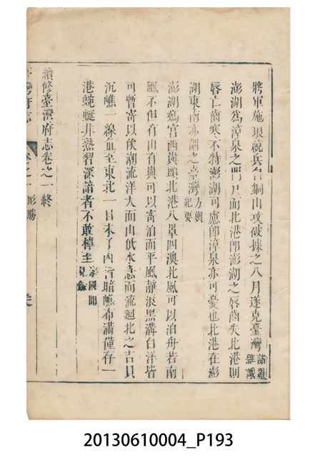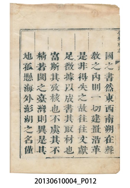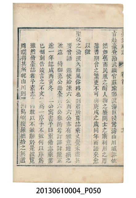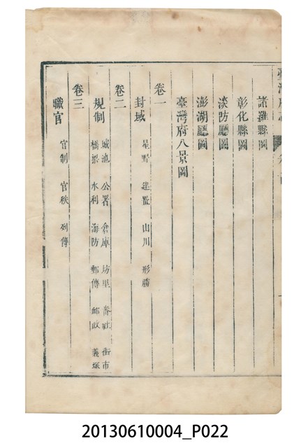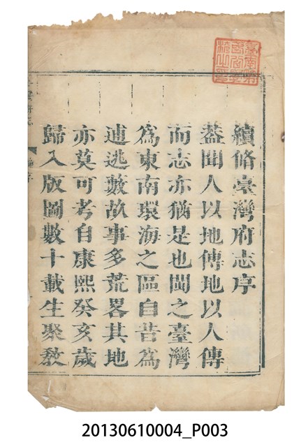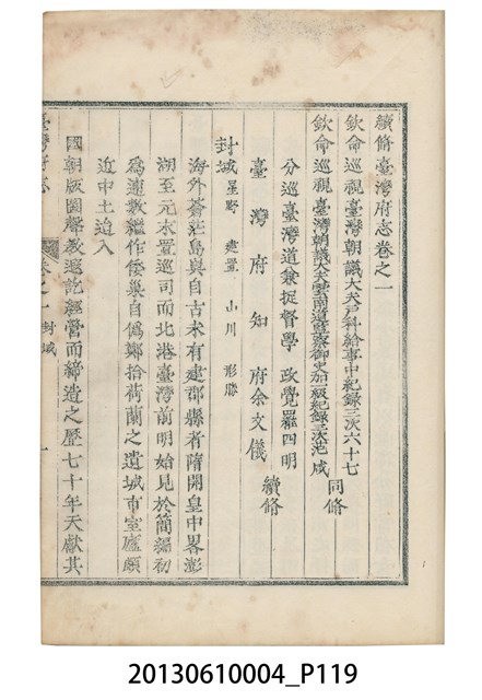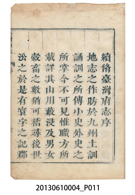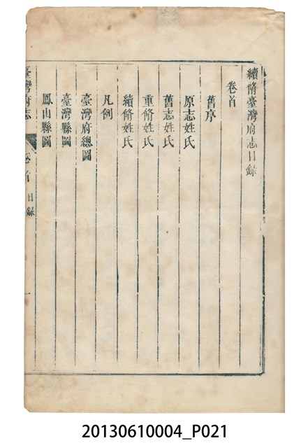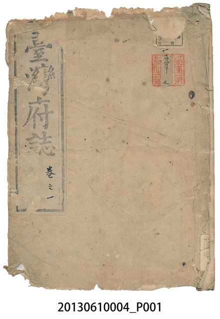 此文物為清臺灣府知余文儀續修之史書。《臺灣府志》此一史書,最早開始於蔣毓英康熙24年(1685)至康熙25年(1686)之編纂,後歷經康熙年間高拱乾、宋永清、周元文,以及乾隆時期劉良璧、范咸等人的修改增補。而此一《續修臺灣府志》最早的版本,即為余文儀以范咸的《重修臺灣府志》為底本增加修改,纂修於乾隆25年(1760)至乾隆27年(1762),發刊於乾隆39年(1774)之版本。此一版本後續於清領時期同治11年(1872)、光緒14年(1888);以及日治時期明治32年(1899)年,有過不同版本之補刻。陳漢光〈臺灣地方志展覽會特輯〉一文,曾勘對同治11年(1872)、光緒14年(1888)以及明治32年(1899)年三種補刻本與最早乾隆39年版本不同文字刻補之相異處,此一文物據此查對,文字、排版應為光緒14年(1888)之刻版。《續修臺灣府志》原書共有卷首以及一至二十六卷;此一文物共有11冊,缺漏二十五至二十六卷,此11冊書籍,皆於封面及內文首頁,另印有「臺南第二公學校」之印章。「臺南第二公學校」創校於明治31年(1898年),此一校名延續至昭和11年(1936)年始改易為「寶公學校」,故據上述資料對照,此一文物應為光緒14年(1888)至昭和11年(1936)之文物。《續修臺灣府志》全書共分有:〈卷首〉、〈卷一:封域〉、〈卷二:規制〉、〈卷三:職官〉、〈卷四:賦役一〉、〈卷五:賦役二〉、〈卷六:賦役三〉、〈卷七:典禮〉、〈卷八:學校〉、〈卷九:武備一〉、〈卷十:武備二〉、〈卷十一:武備三〉、〈卷十二:人物〉、〈卷十三:風俗一〉、〈卷十四:風俗二〉、〈卷十五:風俗三〉、〈卷十六:風俗四〉、〈卷十七:物產一〉、〈卷十八:物產二〉、〈卷十九:雜記〉、〈卷二十:藝文一〉、〈卷二十一:藝文二〉、〈卷二十二:藝文三〉、〈卷二十三:藝文四〉、〈卷二十四:藝文五〉、〈卷二十五:藝文六〉以及〈卷二十六:藝文七〉。此冊書含〈卷首〉以及〈卷一〉。