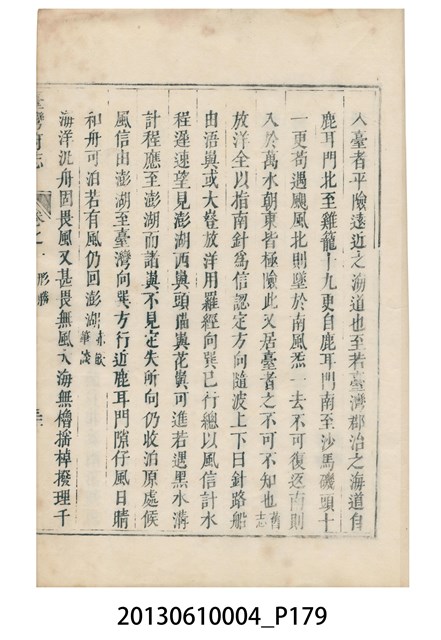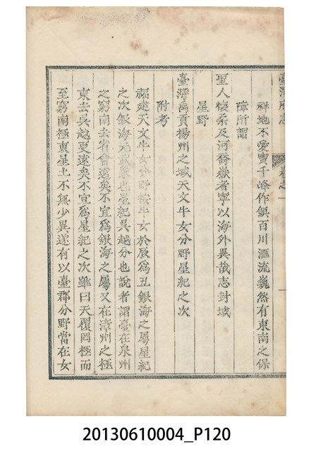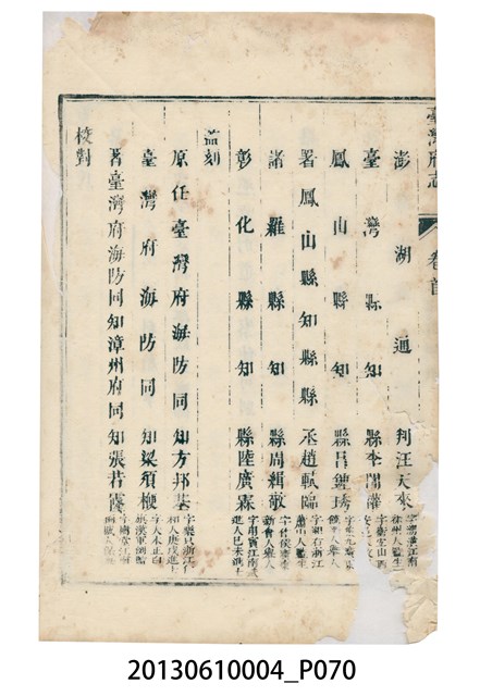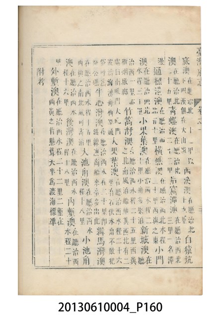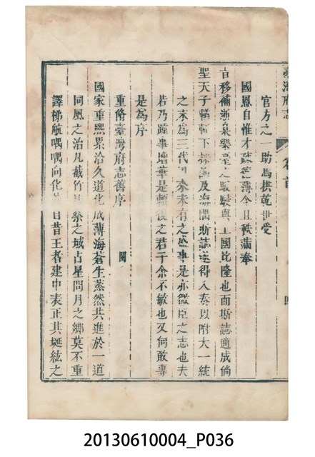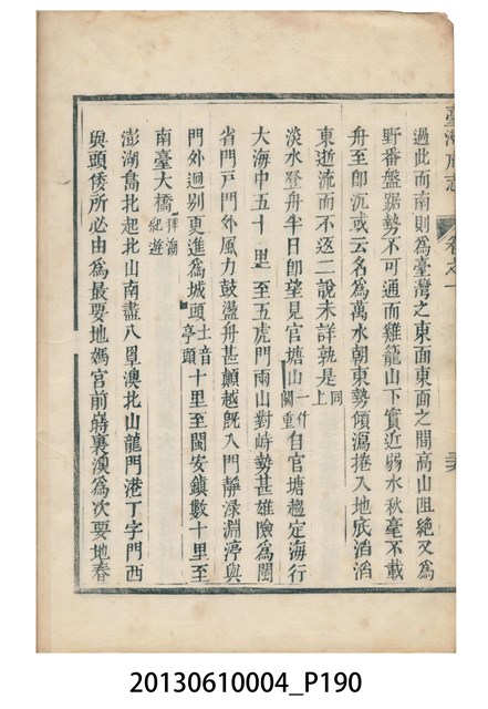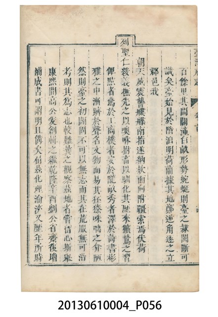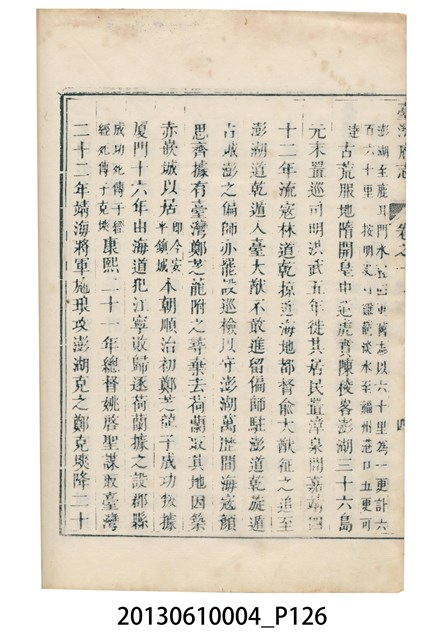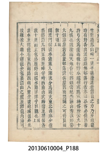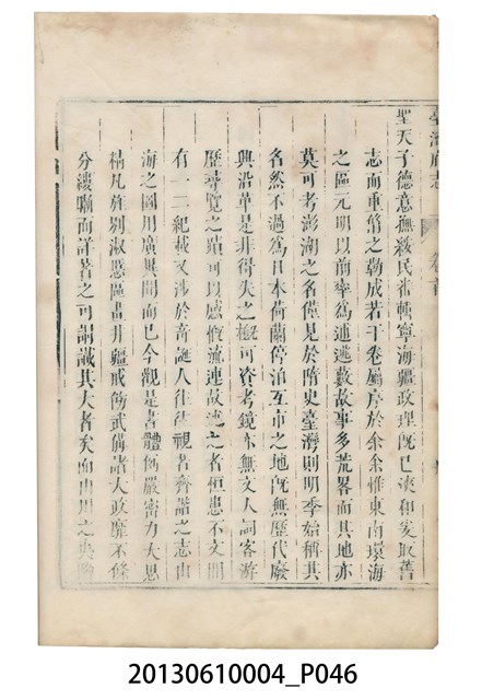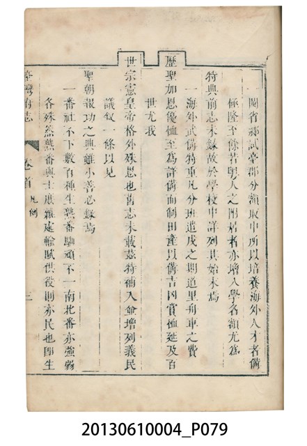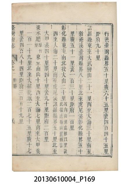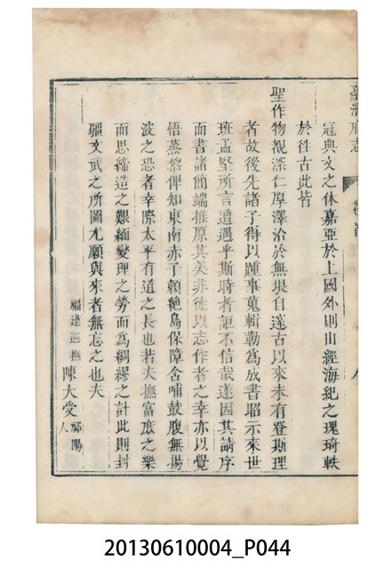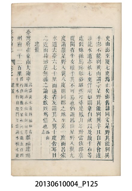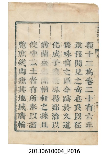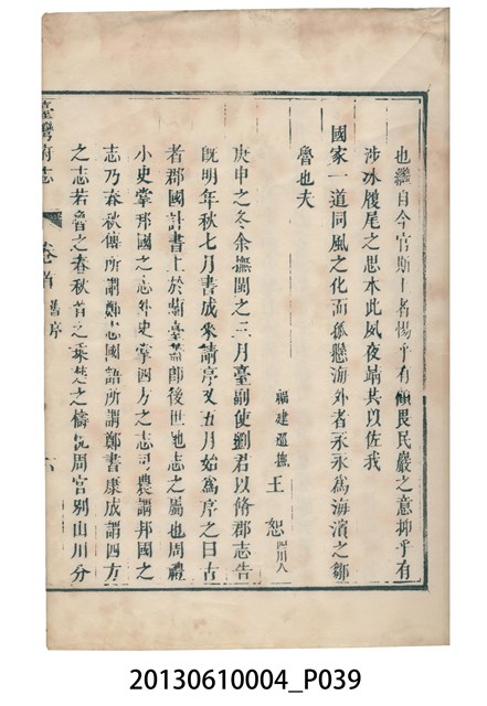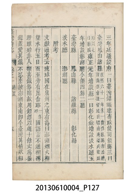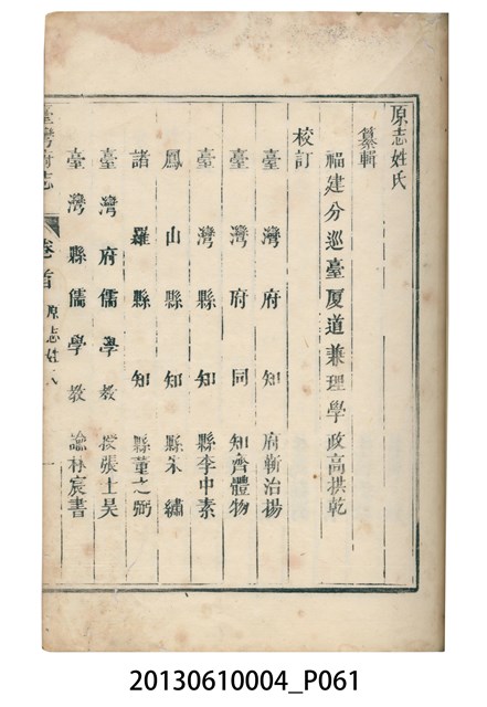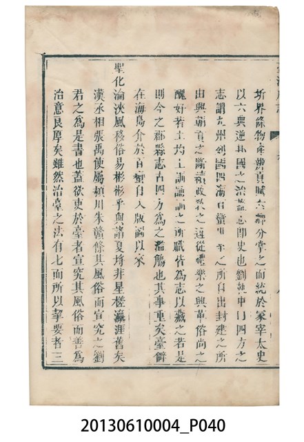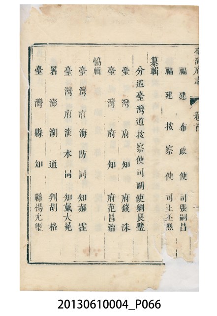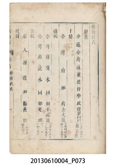 此文物為清臺灣府知余文儀續修之史書。《臺灣府志》此一史書,最早開始於蔣毓英康熙24年(1685)至康熙25年(1686)之編纂,後歷經康熙年間高拱乾、宋永清、周元文,以及乾隆時期劉良璧、范咸等人的修改增補。而此一《續修臺灣府志》最早的版本,即為余文儀以范咸的《重修臺灣府志》為底本增加修改,纂修於乾隆25年(1760)至乾隆27年(1762),發刊於乾隆39年(1774)之版本。此一版本後續於清領時期同治11年(1872)、光緒14年(1888);以及日治時期明治32年(1899)年,有過不同版本之補刻。陳漢光〈臺灣地方志展覽會特輯〉一文,曾勘對同治11年(1872)、光緒14年(1888)以及明治32年(1899)年三種補刻本與最早乾隆39年版本不同文字刻補之相異處,此一文物據此查對,文字、排版應為光緒14年(1888)之刻版。《續修臺灣府志》原書共有卷首以及一至二十六卷;此一文物共有11冊,缺漏二十五至二十六卷,此11冊書籍,皆於封面及內文首頁,另印有「臺南第二公學校」之印章。「臺南第二公學校」創校於明治31年(1898年),此一校名延續至昭和11年(1936)年始改易為「寶公學校」,故據上述資料對照,此一文物應為光緒14年(1888)至昭和11年(1936)之文物。《續修臺灣府志》全書共分有:〈卷首〉、〈卷一:封域〉、〈卷二:規制〉、〈卷三:職官〉、〈卷四:賦役一〉、〈卷五:賦役二〉、〈卷六:賦役三〉、〈卷七:典禮〉、〈卷八:學校〉、〈卷九:武備一〉、〈卷十:武備二〉、〈卷十一:武備三〉、〈卷十二:人物〉、〈卷十三:風俗一〉、〈卷十四:風俗二〉、〈卷十五:風俗三〉、〈卷十六:風俗四〉、〈卷十七:物產一〉、〈卷十八:物產二〉、〈卷十九:雜記〉、〈卷二十:藝文一〉、〈卷二十一:藝文二〉、〈卷二十二:藝文三〉、〈卷二十三:藝文四〉、〈卷二十四:藝文五〉、〈卷二十五:藝文六〉以及〈卷二十六:藝文七〉。此冊書含〈卷首〉以及〈卷一〉。