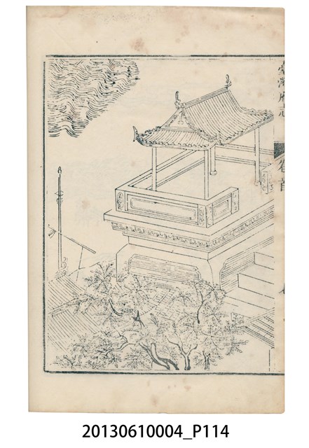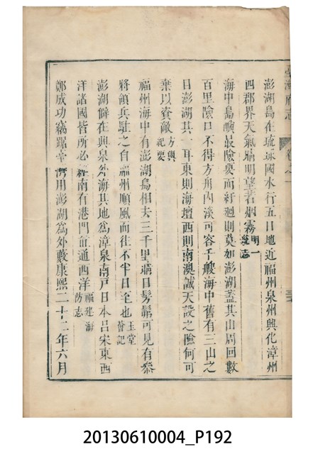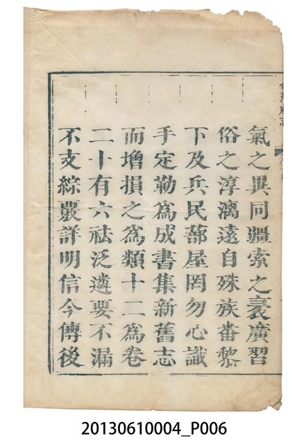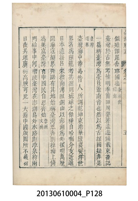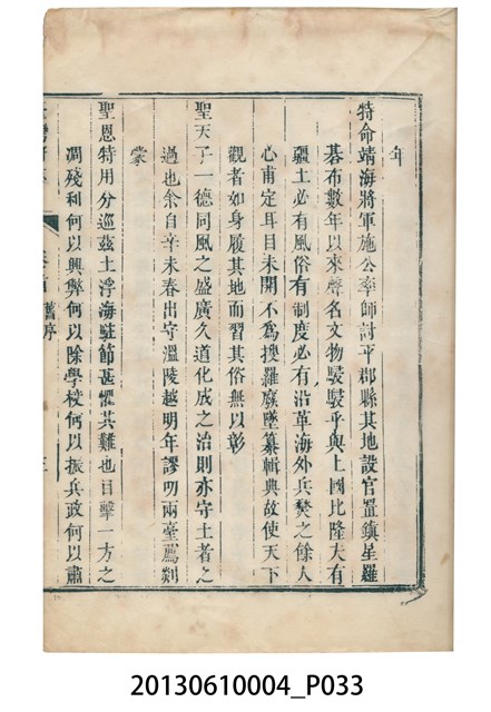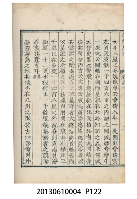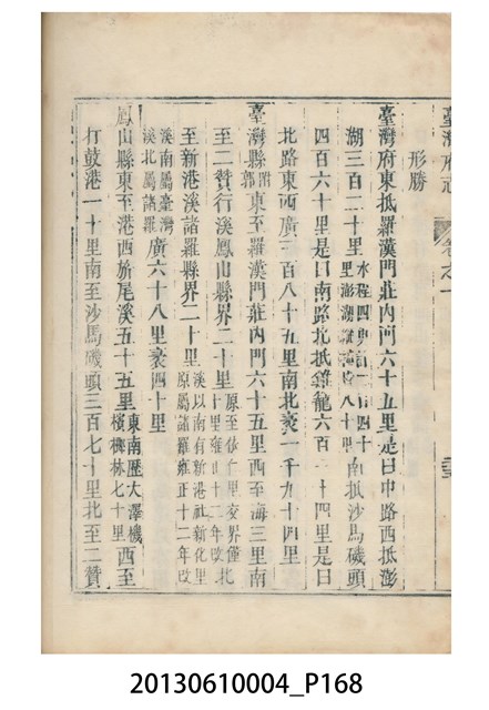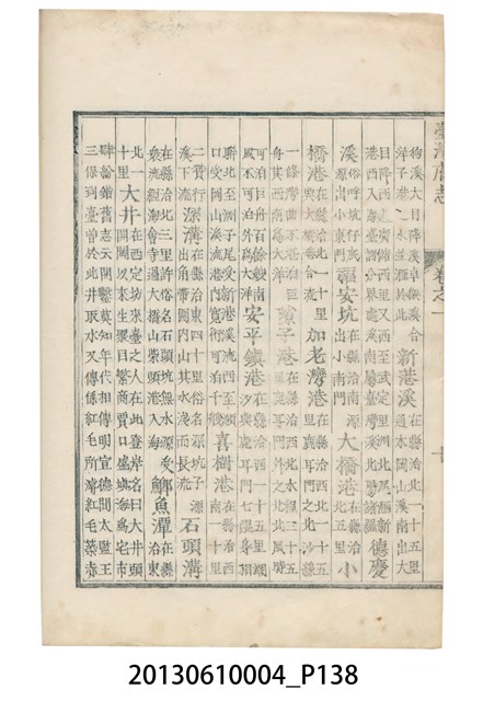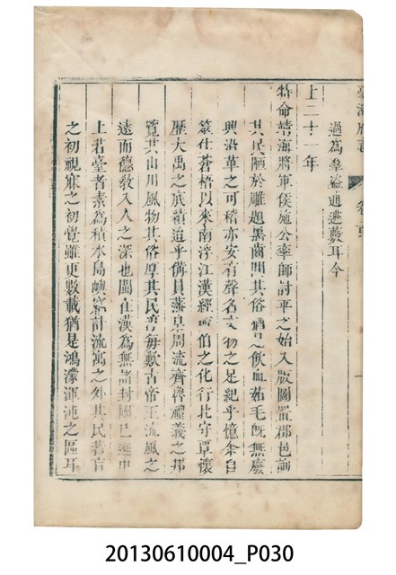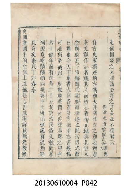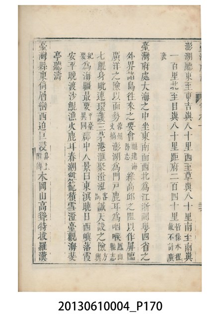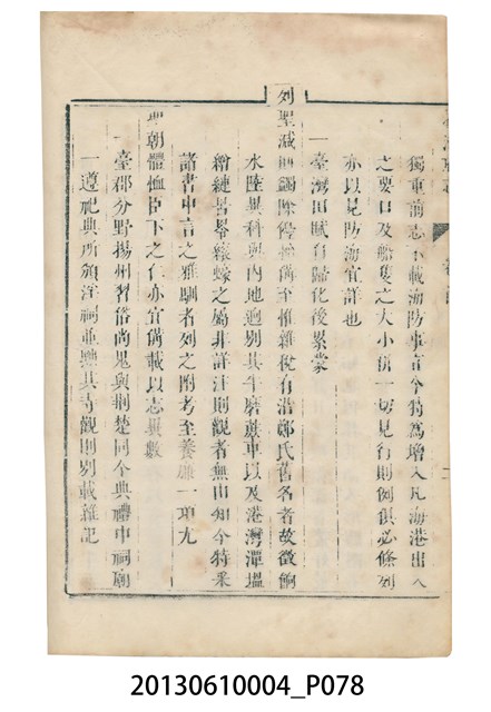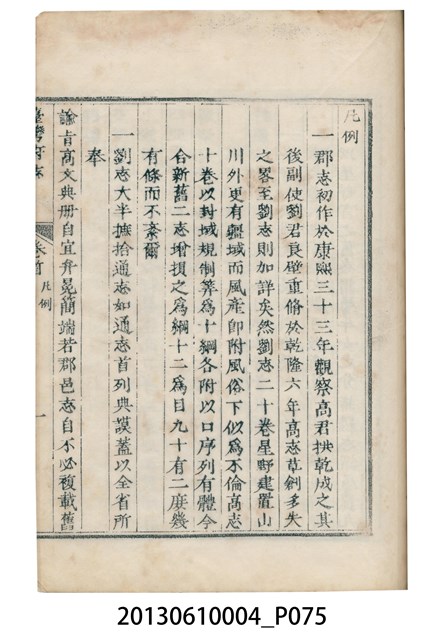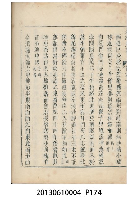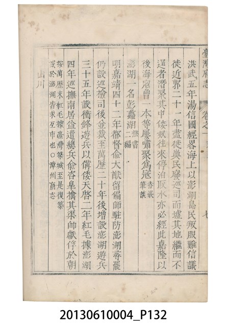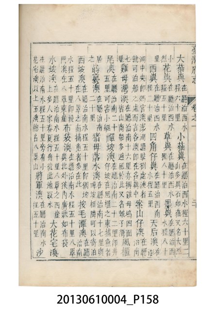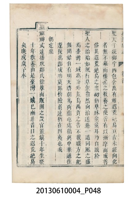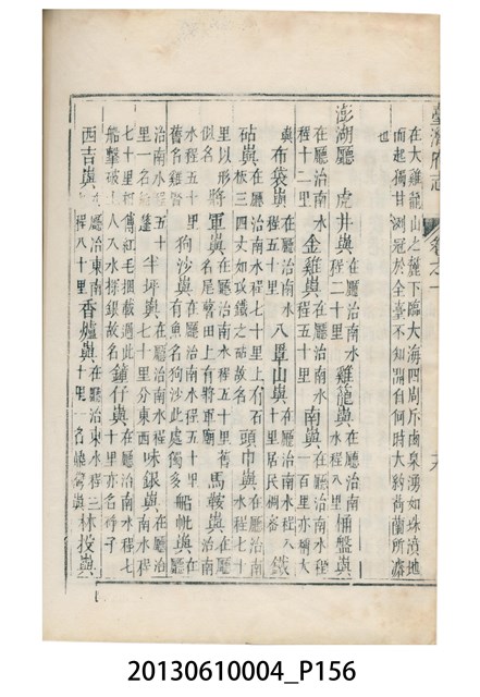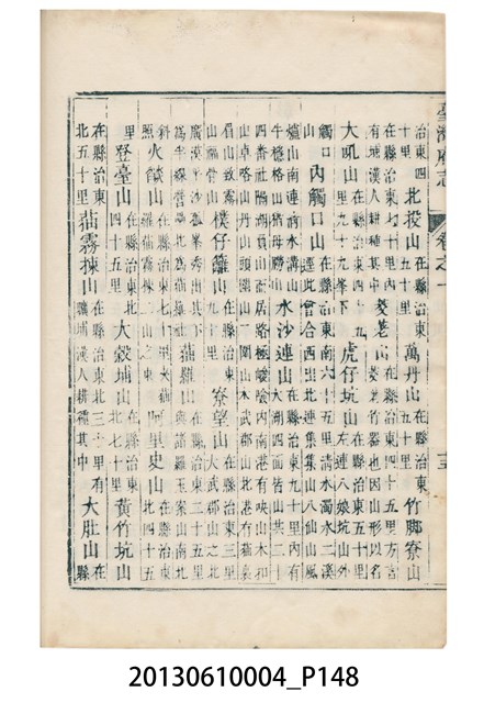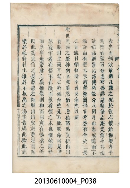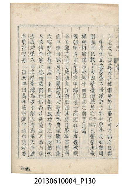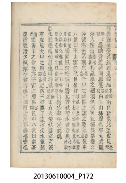 此文物為清臺灣府知余文儀續修之史書。《臺灣府志》此一史書,最早開始於蔣毓英康熙24年(1685)至康熙25年(1686)之編纂,後歷經康熙年間高拱乾、宋永清、周元文,以及乾隆時期劉良璧、范咸等人的修改增補。而此一《續修臺灣府志》最早的版本,即為余文儀以范咸的《重修臺灣府志》為底本增加修改,纂修於乾隆25年(1760)至乾隆27年(1762),發刊於乾隆39年(1774)之版本。此一版本後續於清領時期同治11年(1872)、光緒14年(1888);以及日治時期明治32年(1899)年,有過不同版本之補刻。陳漢光〈臺灣地方志展覽會特輯〉一文,曾勘對同治11年(1872)、光緒14年(1888)以及明治32年(1899)年三種補刻本與最早乾隆39年版本不同文字刻補之相異處,此一文物據此查對,文字、排版應為光緒14年(1888)之刻版。《續修臺灣府志》原書共有卷首以及一至二十六卷;此一文物共有11冊,缺漏二十五至二十六卷,此11冊書籍,皆於封面及內文首頁,另印有「臺南第二公學校」之印章。「臺南第二公學校」創校於明治31年(1898年),此一校名延續至昭和11年(1936)年始改易為「寶公學校」,故據上述資料對照,此一文物應為光緒14年(1888)至昭和11年(1936)之文物。《續修臺灣府志》全書共分有:〈卷首〉、〈卷一:封域〉、〈卷二:規制〉、〈卷三:職官〉、〈卷四:賦役一〉、〈卷五:賦役二〉、〈卷六:賦役三〉、〈卷七:典禮〉、〈卷八:學校〉、〈卷九:武備一〉、〈卷十:武備二〉、〈卷十一:武備三〉、〈卷十二:人物〉、〈卷十三:風俗一〉、〈卷十四:風俗二〉、〈卷十五:風俗三〉、〈卷十六:風俗四〉、〈卷十七:物產一〉、〈卷十八:物產二〉、〈卷十九:雜記〉、〈卷二十:藝文一〉、〈卷二十一:藝文二〉、〈卷二十二:藝文三〉、〈卷二十三:藝文四〉、〈卷二十四:藝文五〉、〈卷二十五:藝文六〉以及〈卷二十六:藝文七〉。此冊書含〈卷首〉以及〈卷一〉。