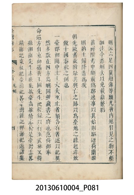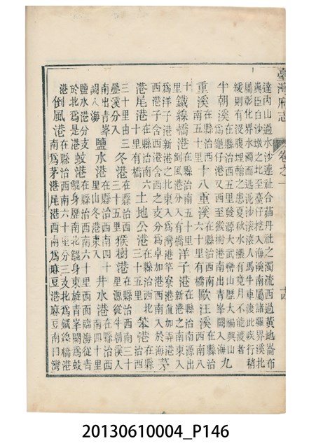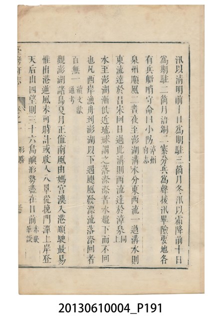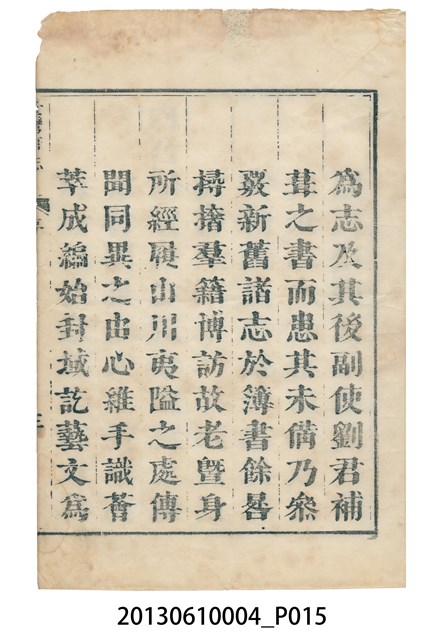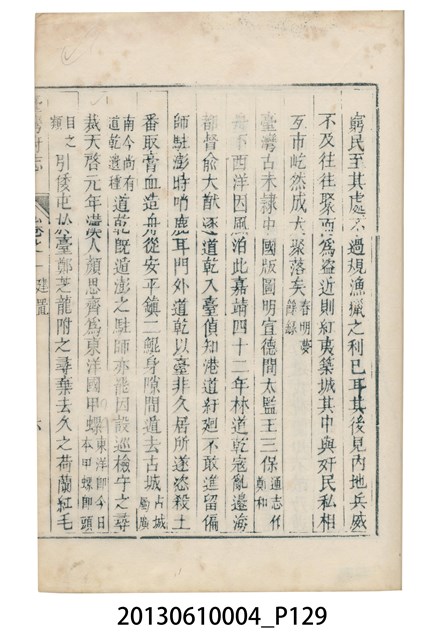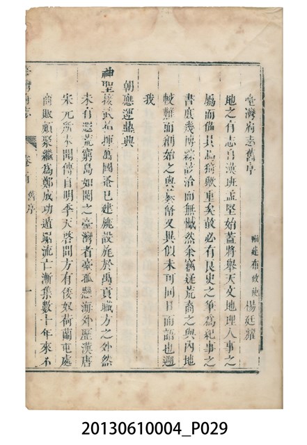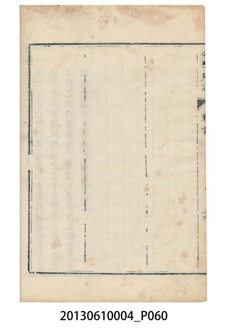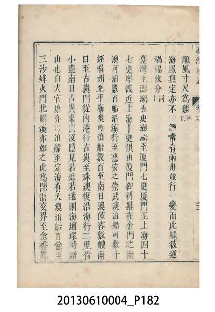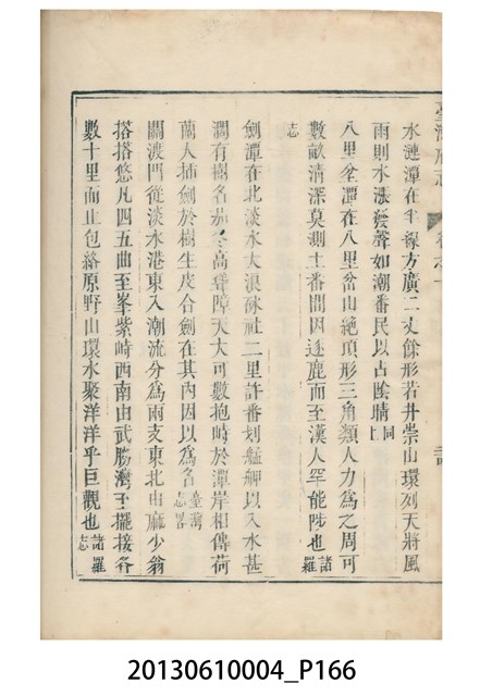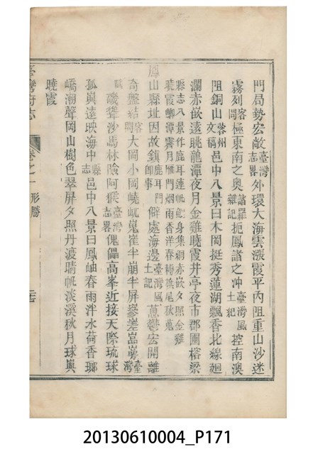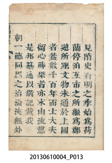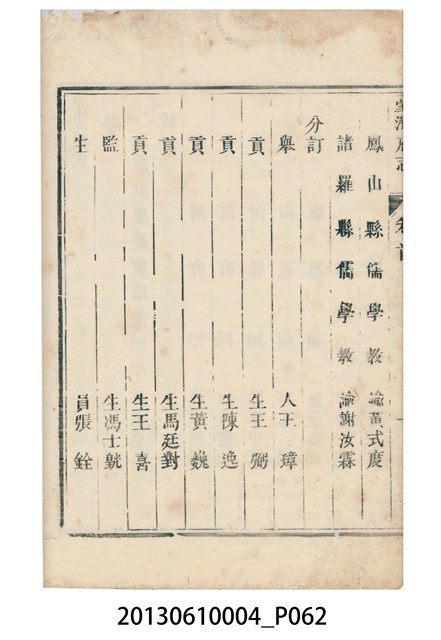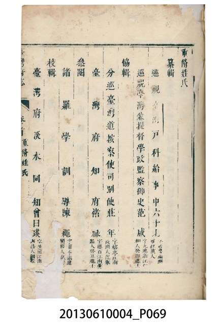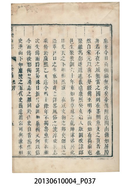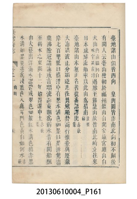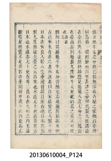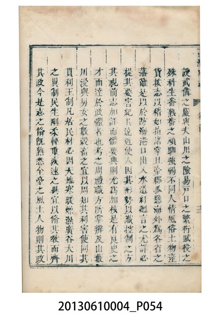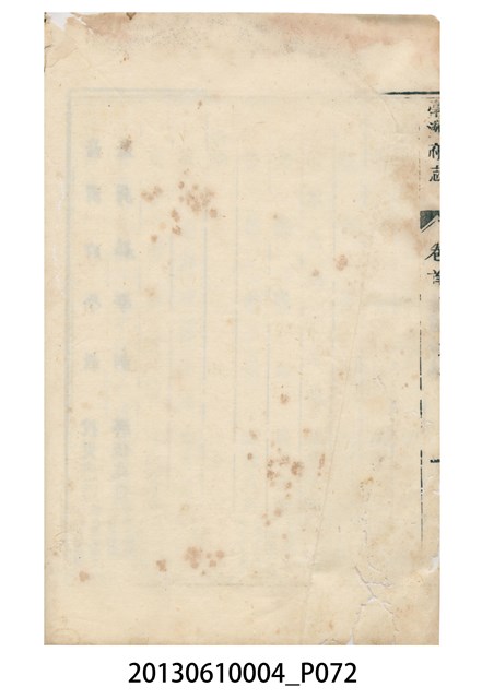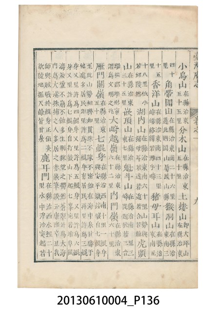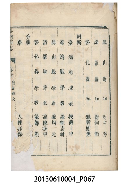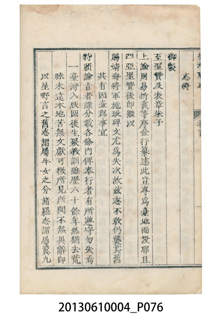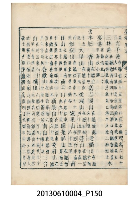 此文物為清臺灣府知余文儀續修之史書。《臺灣府志》此一史書,最早開始於蔣毓英康熙24年(1685)至康熙25年(1686)之編纂,後歷經康熙年間高拱乾、宋永清、周元文,以及乾隆時期劉良璧、范咸等人的修改增補。而此一《續修臺灣府志》最早的版本,即為余文儀以范咸的《重修臺灣府志》為底本增加修改,纂修於乾隆25年(1760)至乾隆27年(1762),發刊於乾隆39年(1774)之版本。此一版本後續於清領時期同治11年(1872)、光緒14年(1888);以及日治時期明治32年(1899)年,有過不同版本之補刻。陳漢光〈臺灣地方志展覽會特輯〉一文,曾勘對同治11年(1872)、光緒14年(1888)以及明治32年(1899)年三種補刻本與最早乾隆39年版本不同文字刻補之相異處,此一文物據此查對,文字、排版應為光緒14年(1888)之刻版。《續修臺灣府志》原書共有卷首以及一至二十六卷;此一文物共有11冊,缺漏二十五至二十六卷,此11冊書籍,皆於封面及內文首頁,另印有「臺南第二公學校」之印章。「臺南第二公學校」創校於明治31年(1898年),此一校名延續至昭和11年(1936)年始改易為「寶公學校」,故據上述資料對照,此一文物應為光緒14年(1888)至昭和11年(1936)之文物。《續修臺灣府志》全書共分有:〈卷首〉、〈卷一:封域〉、〈卷二:規制〉、〈卷三:職官〉、〈卷四:賦役一〉、〈卷五:賦役二〉、〈卷六:賦役三〉、〈卷七:典禮〉、〈卷八:學校〉、〈卷九:武備一〉、〈卷十:武備二〉、〈卷十一:武備三〉、〈卷十二:人物〉、〈卷十三:風俗一〉、〈卷十四:風俗二〉、〈卷十五:風俗三〉、〈卷十六:風俗四〉、〈卷十七:物產一〉、〈卷十八:物產二〉、〈卷十九:雜記〉、〈卷二十:藝文一〉、〈卷二十一:藝文二〉、〈卷二十二:藝文三〉、〈卷二十三:藝文四〉、〈卷二十四:藝文五〉、〈卷二十五:藝文六〉以及〈卷二十六:藝文七〉。此冊書含〈卷首〉以及〈卷一〉。