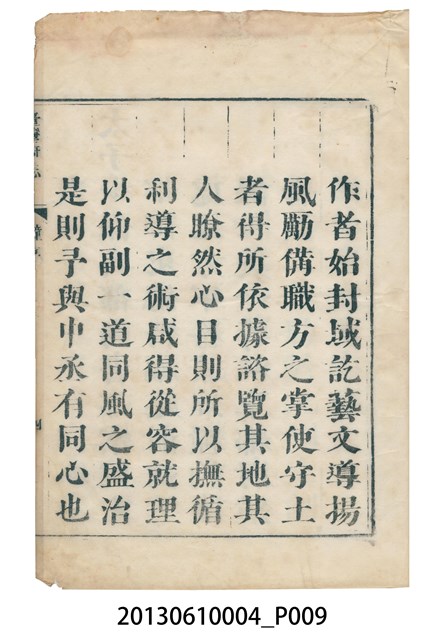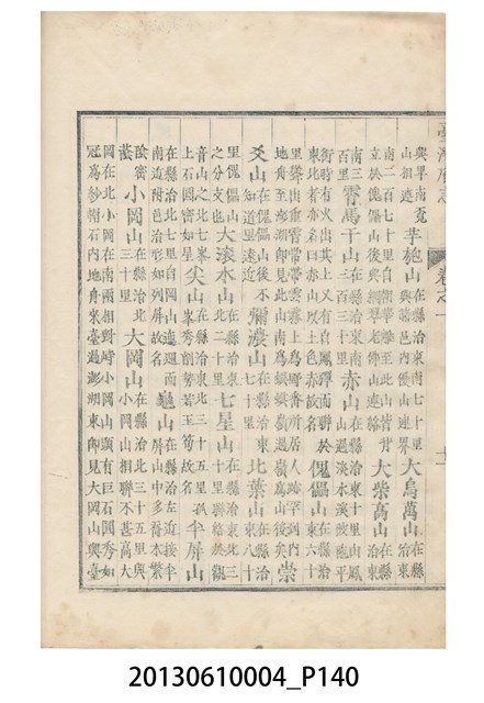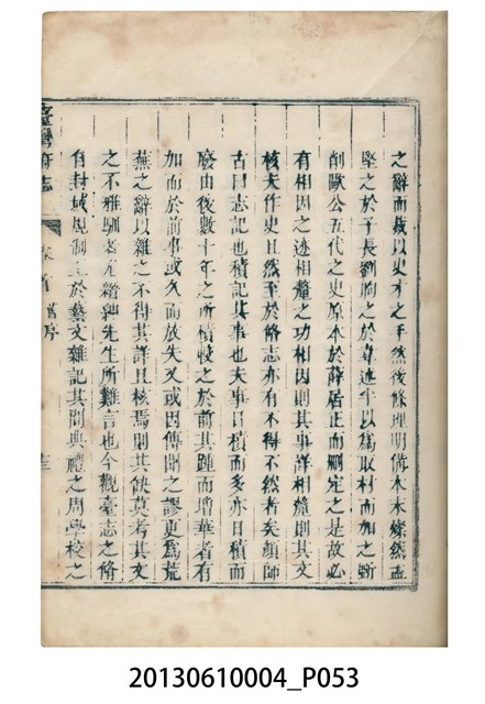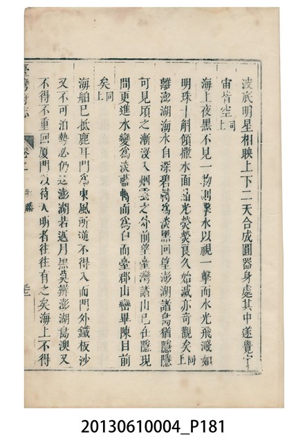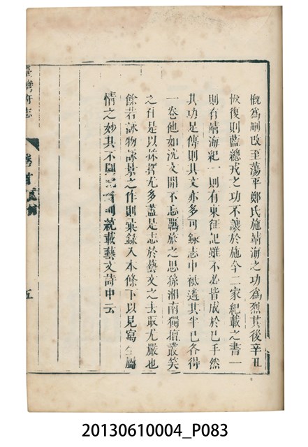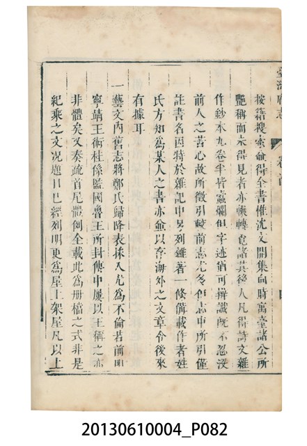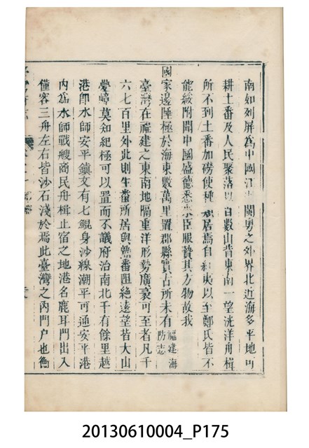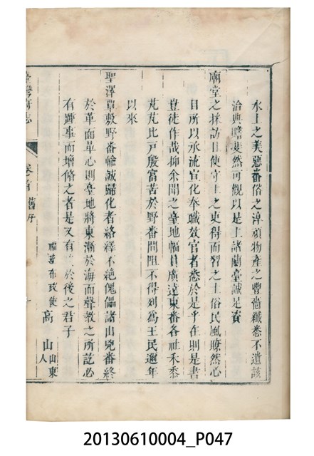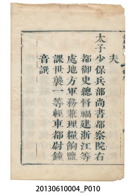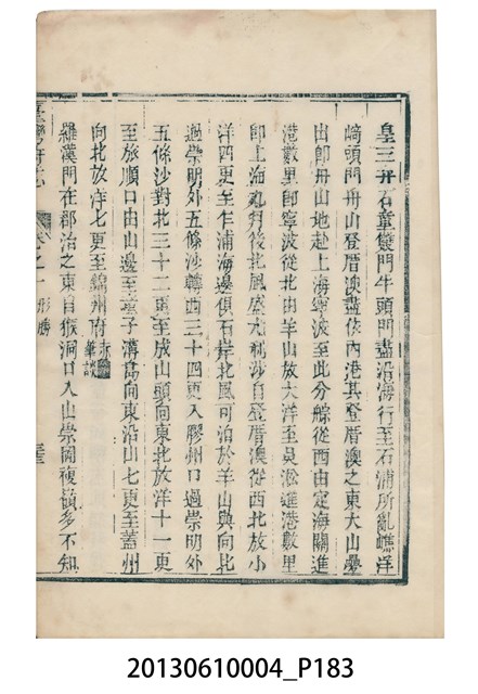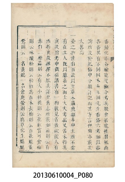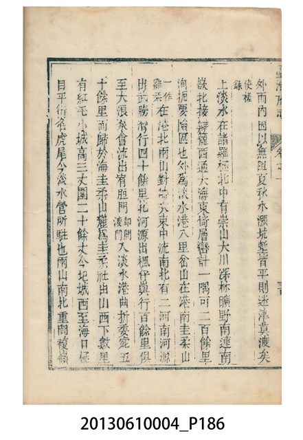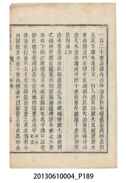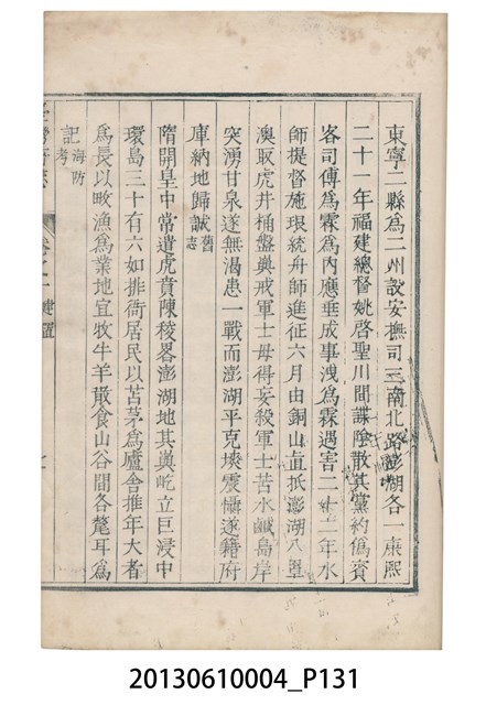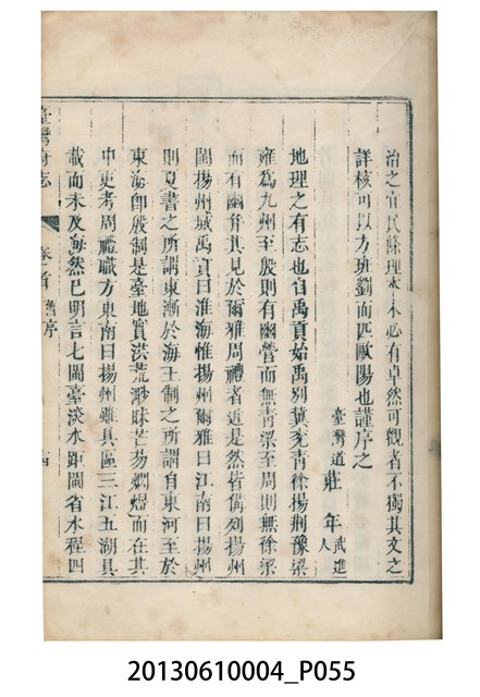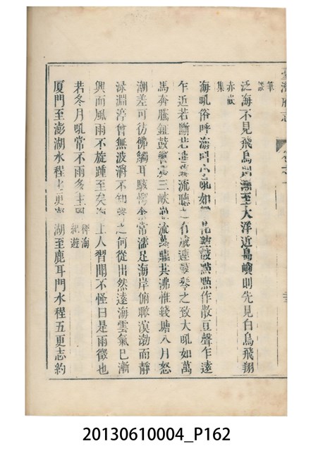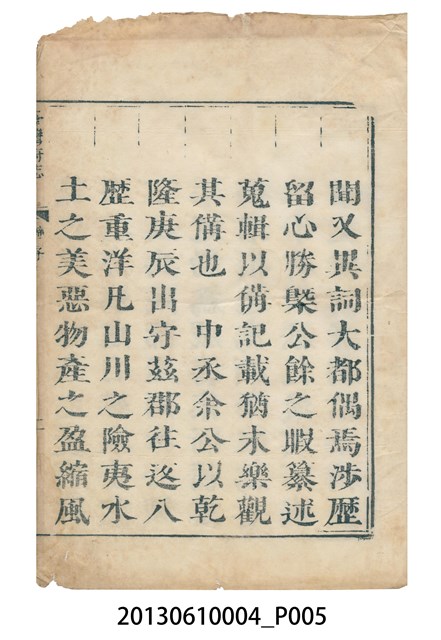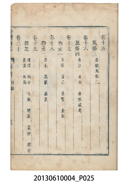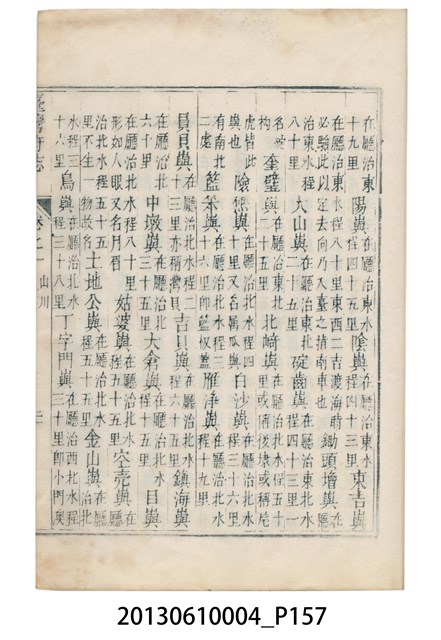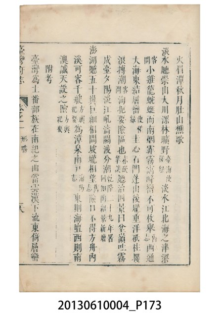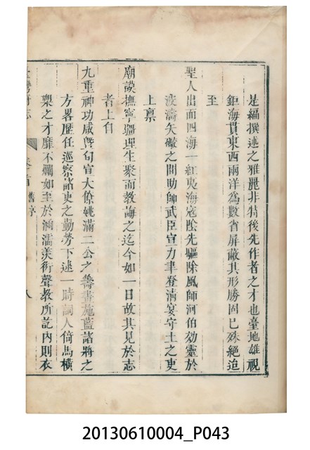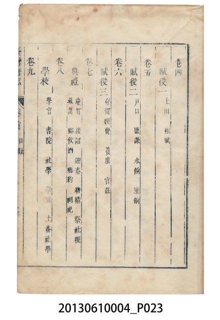 此文物為清臺灣府知余文儀續修之史書。《臺灣府志》此一史書,最早開始於蔣毓英康熙24年(1685)至康熙25年(1686)之編纂,後歷經康熙年間高拱乾、宋永清、周元文,以及乾隆時期劉良璧、范咸等人的修改增補。而此一《續修臺灣府志》最早的版本,即為余文儀以范咸的《重修臺灣府志》為底本增加修改,纂修於乾隆25年(1760)至乾隆27年(1762),發刊於乾隆39年(1774)之版本。此一版本後續於清領時期同治11年(1872)、光緒14年(1888);以及日治時期明治32年(1899)年,有過不同版本之補刻。陳漢光〈臺灣地方志展覽會特輯〉一文,曾勘對同治11年(1872)、光緒14年(1888)以及明治32年(1899)年三種補刻本與最早乾隆39年版本不同文字刻補之相異處,此一文物據此查對,文字、排版應為光緒14年(1888)之刻版。《續修臺灣府志》原書共有卷首以及一至二十六卷;此一文物共有11冊,缺漏二十五至二十六卷,此11冊書籍,皆於封面及內文首頁,另印有「臺南第二公學校」之印章。「臺南第二公學校」創校於明治31年(1898年),此一校名延續至昭和11年(1936)年始改易為「寶公學校」,故據上述資料對照,此一文物應為光緒14年(1888)至昭和11年(1936)之文物。《續修臺灣府志》全書共分有:〈卷首〉、〈卷一:封域〉、〈卷二:規制〉、〈卷三:職官〉、〈卷四:賦役一〉、〈卷五:賦役二〉、〈卷六:賦役三〉、〈卷七:典禮〉、〈卷八:學校〉、〈卷九:武備一〉、〈卷十:武備二〉、〈卷十一:武備三〉、〈卷十二:人物〉、〈卷十三:風俗一〉、〈卷十四:風俗二〉、〈卷十五:風俗三〉、〈卷十六:風俗四〉、〈卷十七:物產一〉、〈卷十八:物產二〉、〈卷十九:雜記〉、〈卷二十:藝文一〉、〈卷二十一:藝文二〉、〈卷二十二:藝文三〉、〈卷二十三:藝文四〉、〈卷二十四:藝文五〉、〈卷二十五:藝文六〉以及〈卷二十六:藝文七〉。此冊書含〈卷首〉以及〈卷一〉。