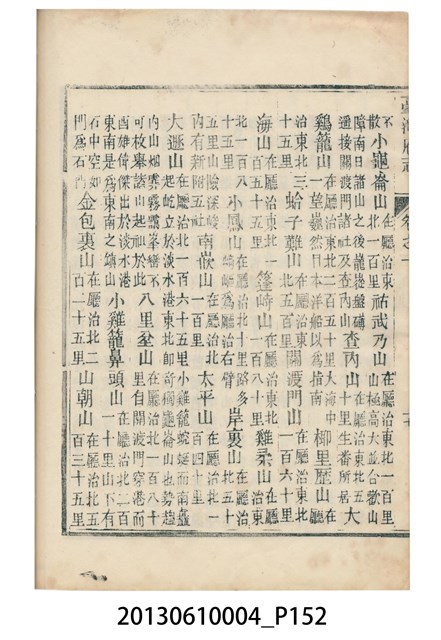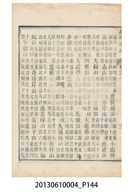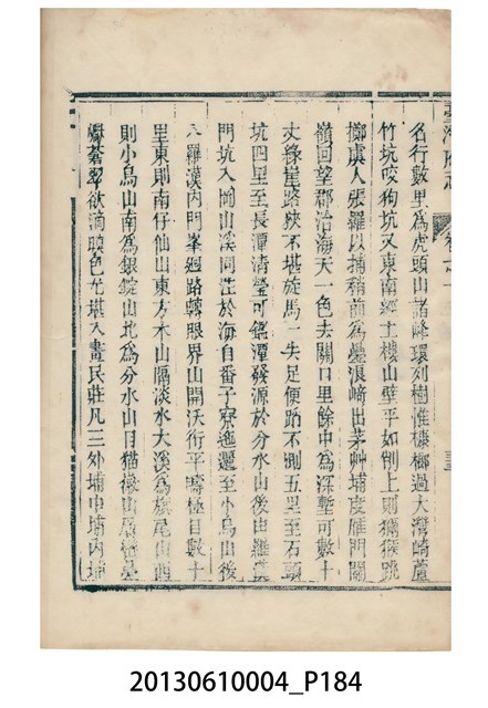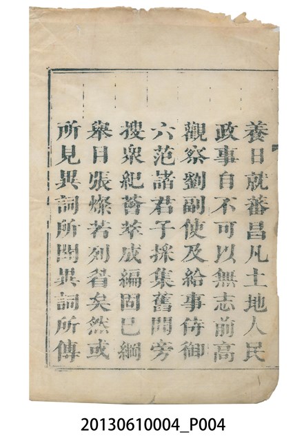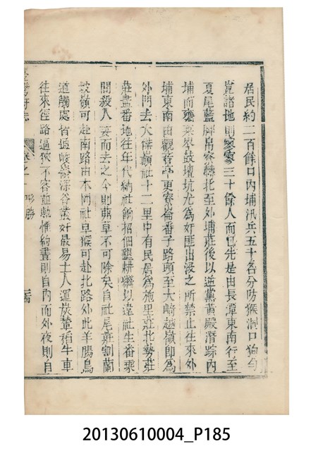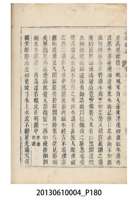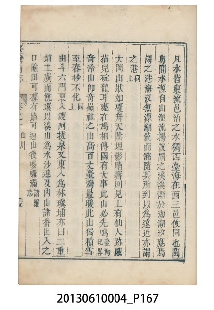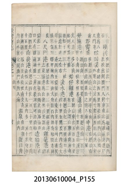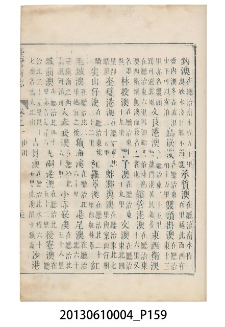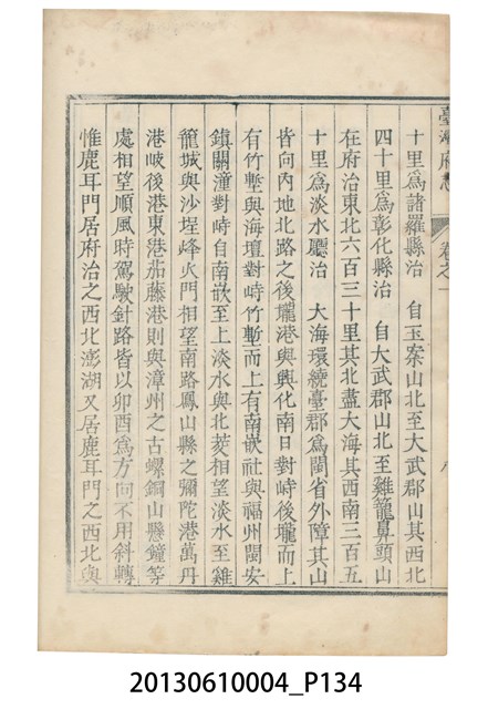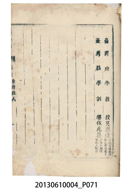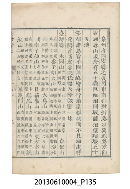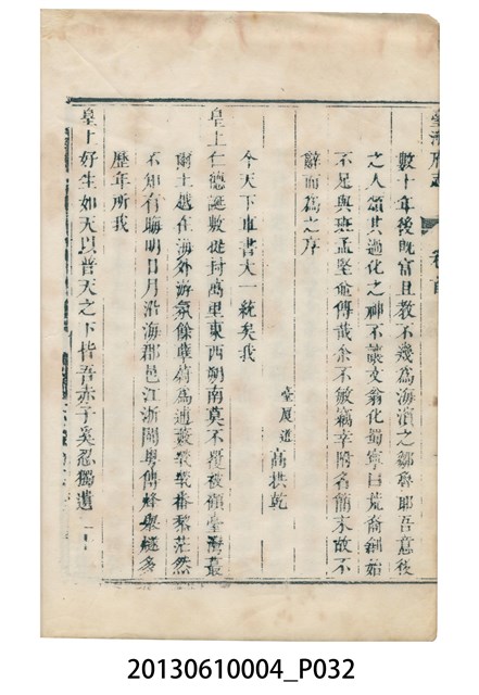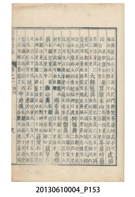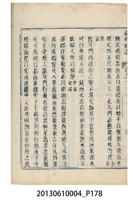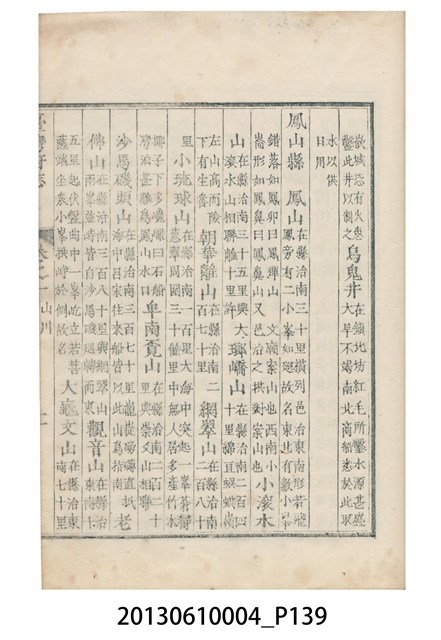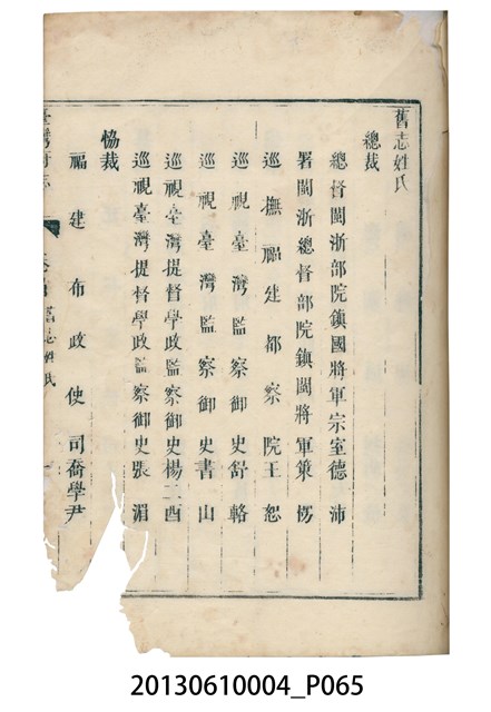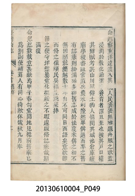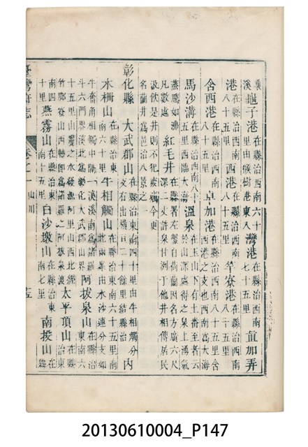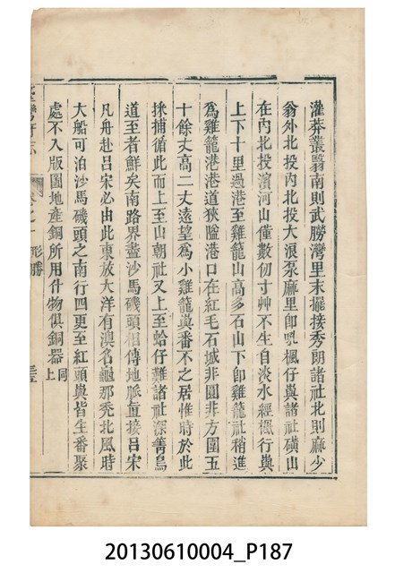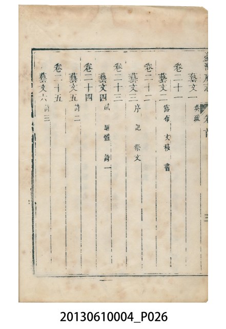 此文物為清臺灣府知余文儀續修之史書。《臺灣府志》此一史書,最早開始於蔣毓英康熙24年(1685)至康熙25年(1686)之編纂,後歷經康熙年間高拱乾、宋永清、周元文,以及乾隆時期劉良璧、范咸等人的修改增補。而此一《續修臺灣府志》最早的版本,即為余文儀以范咸的《重修臺灣府志》為底本增加修改,纂修於乾隆25年(1760)至乾隆27年(1762),發刊於乾隆39年(1774)之版本。此一版本後續於清領時期同治11年(1872)、光緒14年(1888);以及日治時期明治32年(1899)年,有過不同版本之補刻。陳漢光〈臺灣地方志展覽會特輯〉一文,曾勘對同治11年(1872)、光緒14年(1888)以及明治32年(1899)年三種補刻本與最早乾隆39年版本不同文字刻補之相異處,此一文物據此查對,文字、排版應為光緒14年(1888)之刻版。《續修臺灣府志》原書共有卷首以及一至二十六卷;此一文物共有11冊,缺漏二十五至二十六卷,此11冊書籍,皆於封面及內文首頁,另印有「臺南第二公學校」之印章。「臺南第二公學校」創校於明治31年(1898年),此一校名延續至昭和11年(1936)年始改易為「寶公學校」,故據上述資料對照,此一文物應為光緒14年(1888)至昭和11年(1936)之文物。《續修臺灣府志》全書共分有:〈卷首〉、〈卷一:封域〉、〈卷二:規制〉、〈卷三:職官〉、〈卷四:賦役一〉、〈卷五:賦役二〉、〈卷六:賦役三〉、〈卷七:典禮〉、〈卷八:學校〉、〈卷九:武備一〉、〈卷十:武備二〉、〈卷十一:武備三〉、〈卷十二:人物〉、〈卷十三:風俗一〉、〈卷十四:風俗二〉、〈卷十五:風俗三〉、〈卷十六:風俗四〉、〈卷十七:物產一〉、〈卷十八:物產二〉、〈卷十九:雜記〉、〈卷二十:藝文一〉、〈卷二十一:藝文二〉、〈卷二十二:藝文三〉、〈卷二十三:藝文四〉、〈卷二十四:藝文五〉、〈卷二十五:藝文六〉以及〈卷二十六:藝文七〉。此冊書含〈卷首〉以及〈卷一〉。