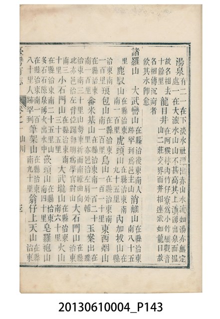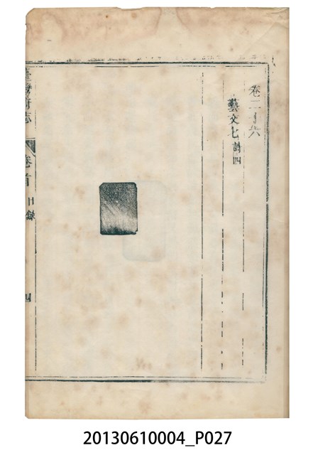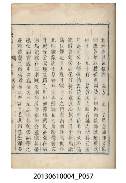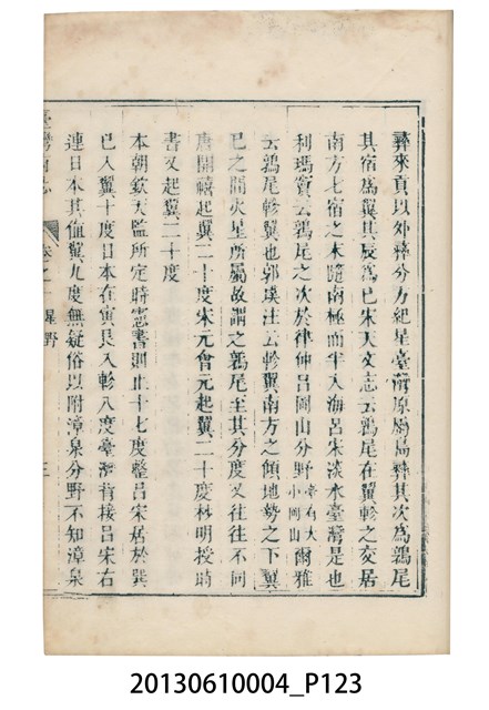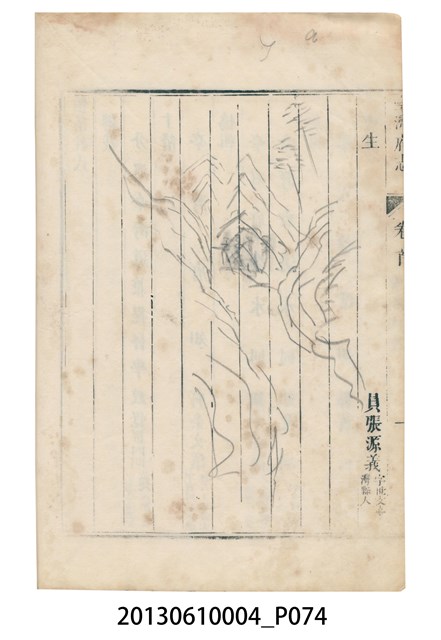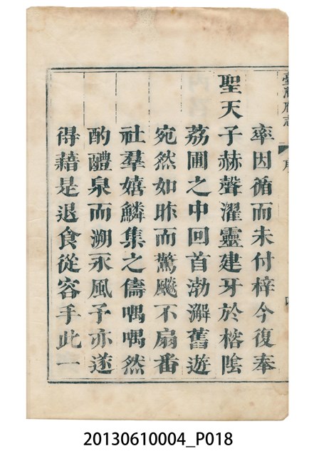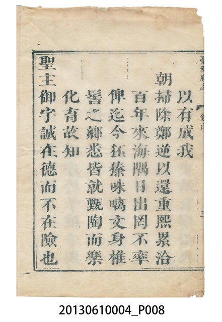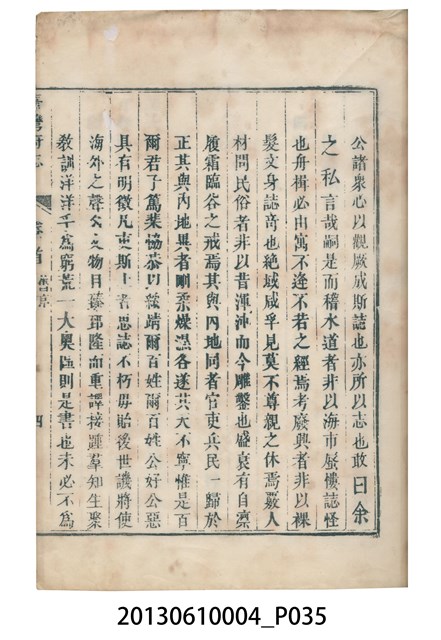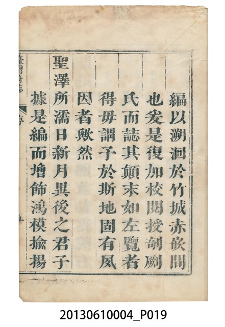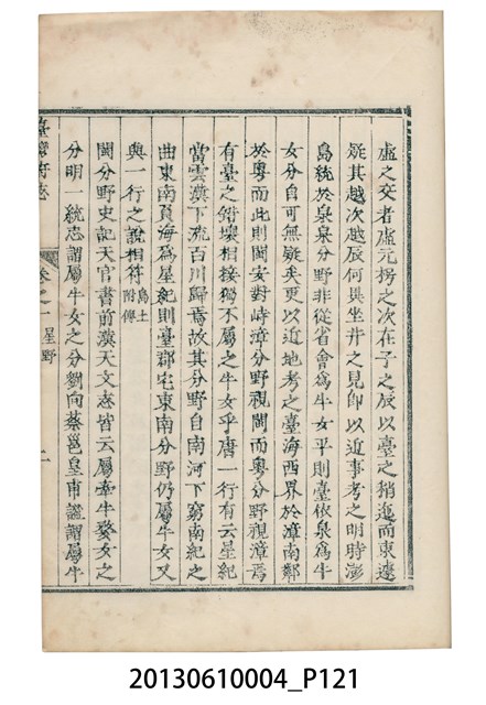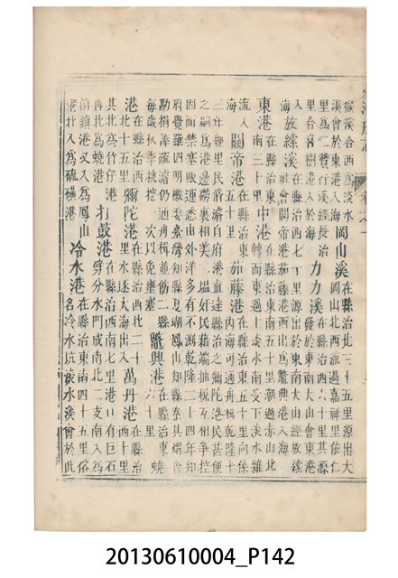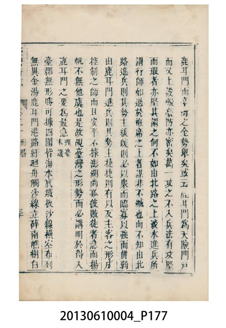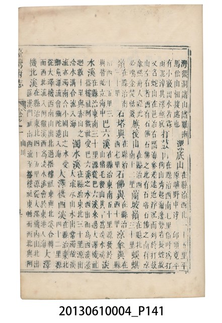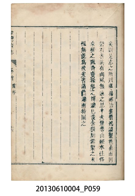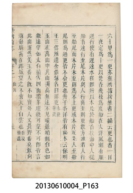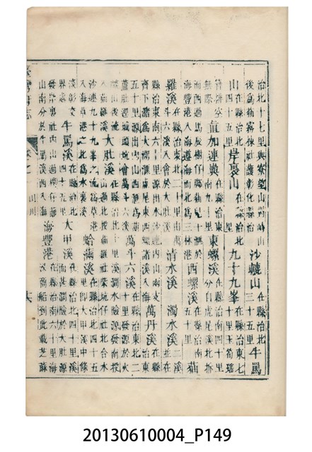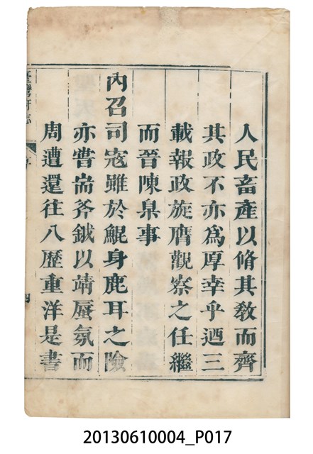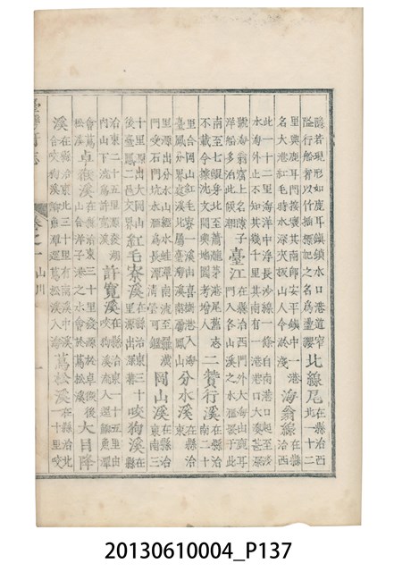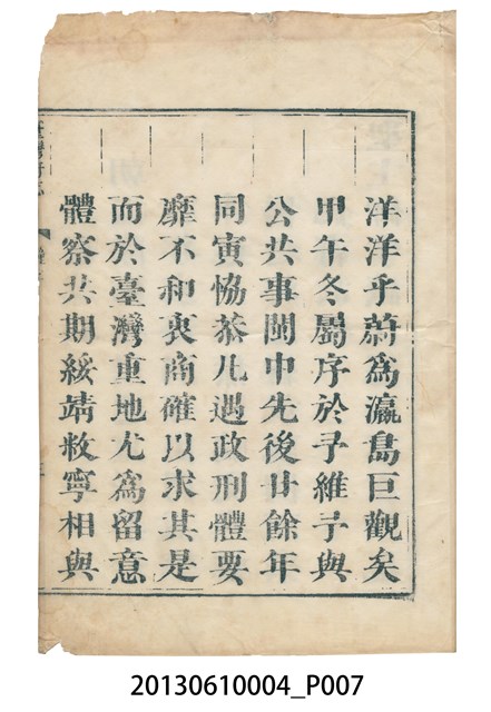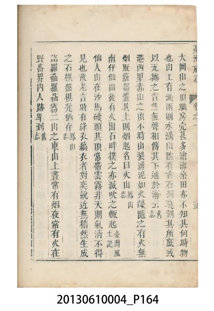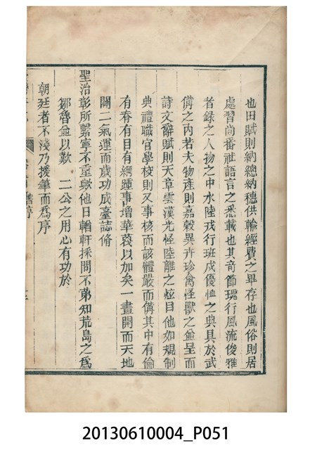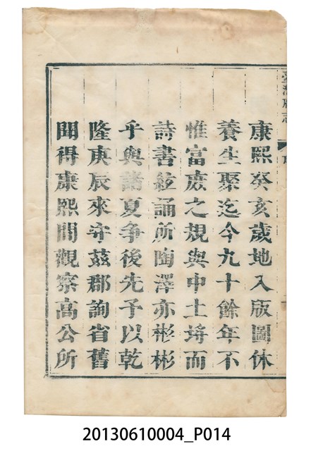 此文物為清臺灣府知余文儀續修之史書。《臺灣府志》此一史書,最早開始於蔣毓英康熙24年(1685)至康熙25年(1686)之編纂,後歷經康熙年間高拱乾、宋永清、周元文,以及乾隆時期劉良璧、范咸等人的修改增補。而此一《續修臺灣府志》最早的版本,即為余文儀以范咸的《重修臺灣府志》為底本增加修改,纂修於乾隆25年(1760)至乾隆27年(1762),發刊於乾隆39年(1774)之版本。此一版本後續於清領時期同治11年(1872)、光緒14年(1888);以及日治時期明治32年(1899)年,有過不同版本之補刻。陳漢光〈臺灣地方志展覽會特輯〉一文,曾勘對同治11年(1872)、光緒14年(1888)以及明治32年(1899)年三種補刻本與最早乾隆39年版本不同文字刻補之相異處,此一文物據此查對,文字、排版應為光緒14年(1888)之刻版。《續修臺灣府志》原書共有卷首以及一至二十六卷;此一文物共有11冊,缺漏二十五至二十六卷,此11冊書籍,皆於封面及內文首頁,另印有「臺南第二公學校」之印章。「臺南第二公學校」創校於明治31年(1898年),此一校名延續至昭和11年(1936)年始改易為「寶公學校」,故據上述資料對照,此一文物應為光緒14年(1888)至昭和11年(1936)之文物。《續修臺灣府志》全書共分有:〈卷首〉、〈卷一:封域〉、〈卷二:規制〉、〈卷三:職官〉、〈卷四:賦役一〉、〈卷五:賦役二〉、〈卷六:賦役三〉、〈卷七:典禮〉、〈卷八:學校〉、〈卷九:武備一〉、〈卷十:武備二〉、〈卷十一:武備三〉、〈卷十二:人物〉、〈卷十三:風俗一〉、〈卷十四:風俗二〉、〈卷十五:風俗三〉、〈卷十六:風俗四〉、〈卷十七:物產一〉、〈卷十八:物產二〉、〈卷十九:雜記〉、〈卷二十:藝文一〉、〈卷二十一:藝文二〉、〈卷二十二:藝文三〉、〈卷二十三:藝文四〉、〈卷二十四:藝文五〉、〈卷二十五:藝文六〉以及〈卷二十六:藝文七〉。此冊書含〈卷首〉以及〈卷一〉。