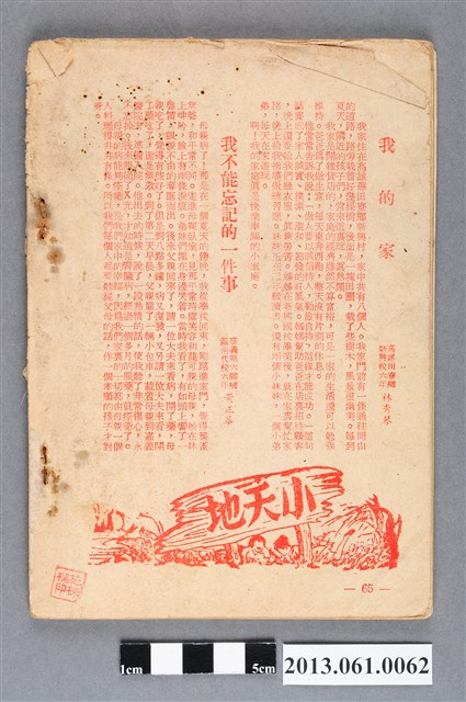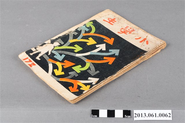 《小學生》由臺灣省政府教育廳於1951年3月20日創刊,採半月刊形式,每月5日、20日為發行日,至1966年停刊。內容包含童話、故事、小說、語文學習、科學、常識、史地、圖畫、兒歌、人物介紹、新書介紹,等各類專欄,也有提供兒童創作的「小天地」。紀錄了1950、1960年代部分社會情狀以及兒童生活。館藏自1957年9月到1966年6月間之《小學生》,計127冊(本案125件,另有館藏2013.014.0003、2013.014.0004等2件),約佔總刊數394之32%。均為32開本,採書訂包裝,封面為彩色印刷,內文為黑、藍、橘、紅間用之單色印刷。於1961年8月以前每期64頁,每本2.5元;自1961年9月起每期96頁,每本4.5元。本件為小學生雜誌社出版《小學生》172號(新第126號)。封面為黑底色,左下有白色人形,並自人形處向右方及上方展出多向、繽紛的箭頭。內容有〈黨國元老─于右任先生〉、〈安德烈‧路德的畫〉、〈戚繼光〉、〈臺灣民族英雄史話〉等人物傳記、歷史故事及其他文章。本件缺封底頁,但於末頁有一長寬皆1公分之「施棟樑印」記。