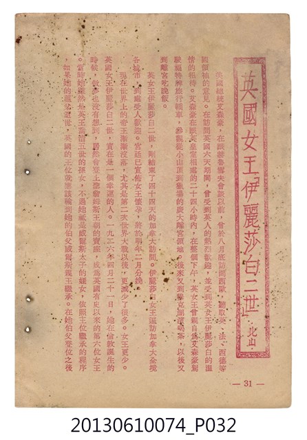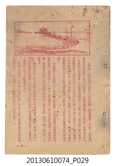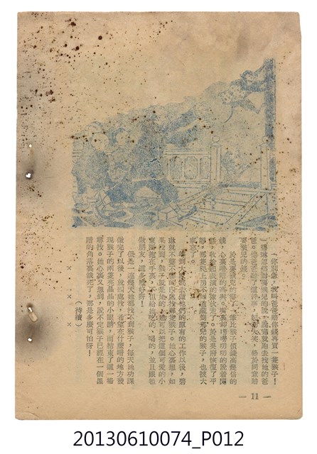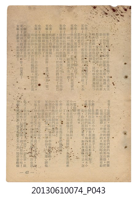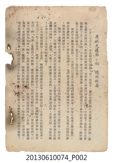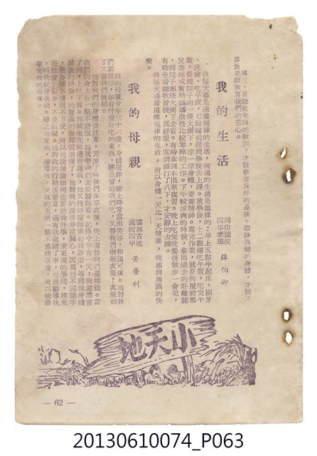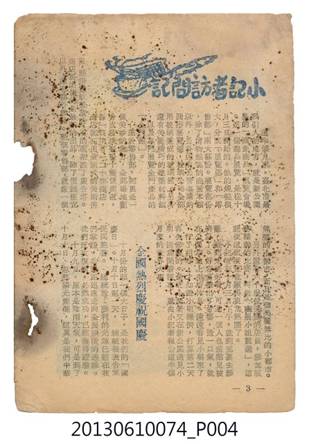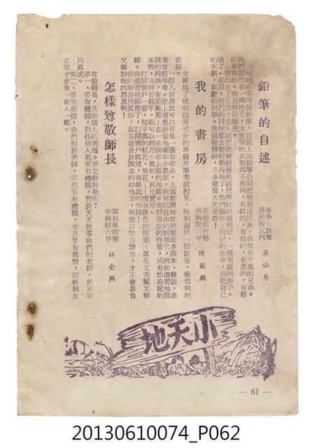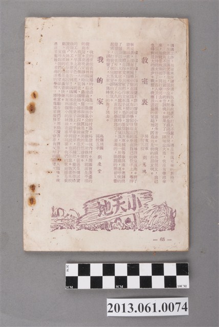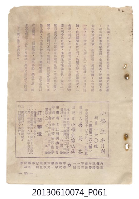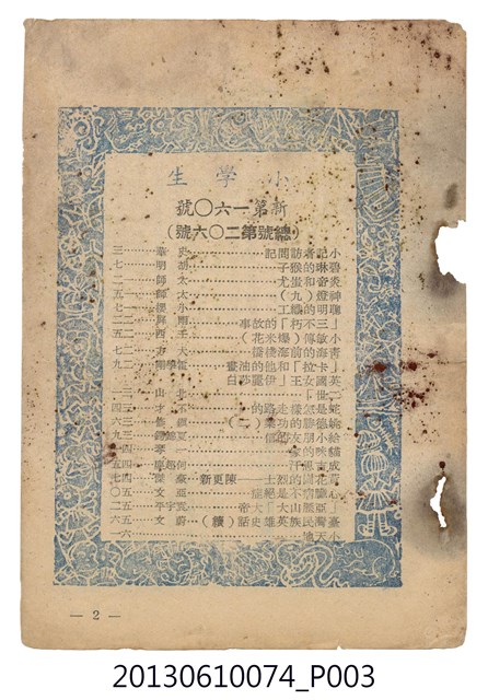 《小學生》由臺灣省政府教育廳於1951年3月20日創刊,採半月刊形式,每月5日、20日為發行日,至1966年停刊。內容包含童話、故事、小說、語文學習、科學、常識、史地、圖畫、兒歌、人物介紹、新書介紹,等各類專欄,也有提供兒童創作的「小天地」。紀錄了1950、1960年代部分社會情狀以及兒童生活。館藏自1957年9月到1966年6月間之《小學生》,計127冊(本案125件,另有館藏2013.014.0003、2013.014.0004等2件),約佔總刊數394之32%。均為32開本,採書訂包裝,封面為彩色印刷,內文為黑、藍、橘、紅間用之單色印刷。於1961年8月以前每期64頁,每本2.5元;自1961年9月起每期96頁,每本4.5元。本件為小學生雜誌社出版《小學生》206號(新第160號)。封面繪有臺灣及疑為澎湖、綠島、蘭嶼等島嶼,中間以紅字書有「慶祝光復節」等五字。內容有〈炎帝和蚩尤〉、〈卡拉和他的油畫〉、〈英國女王伊麗莎白二世〉、〈黃花崗上的烈士─陳更新〉等人物傳記、歷史故事及其他文章。本件缺封底頁。