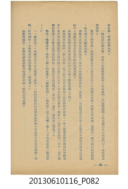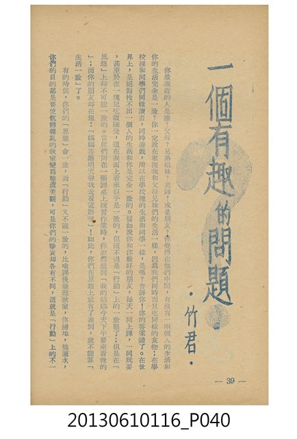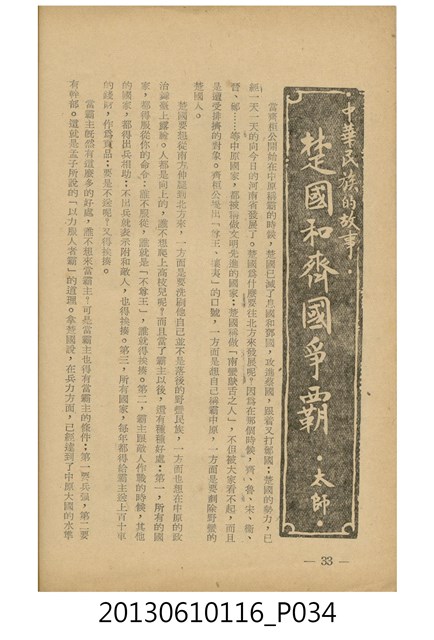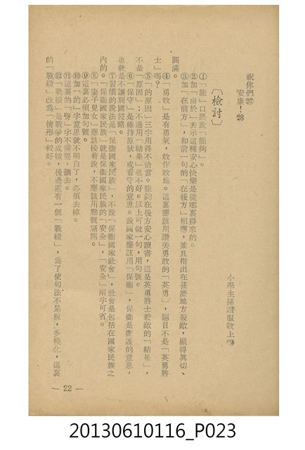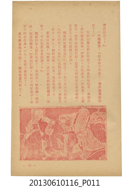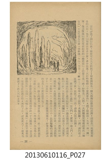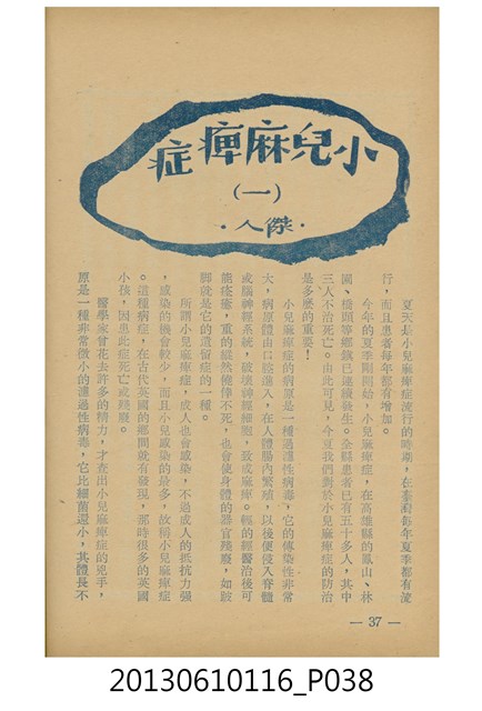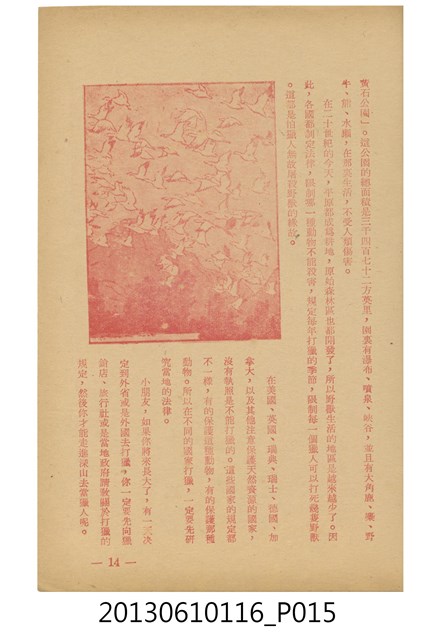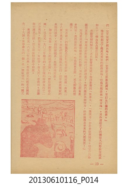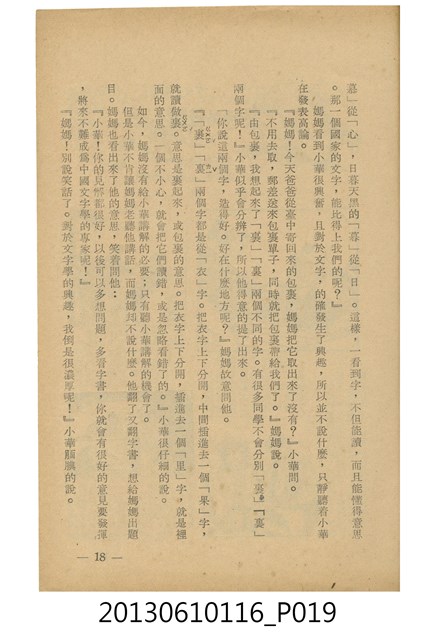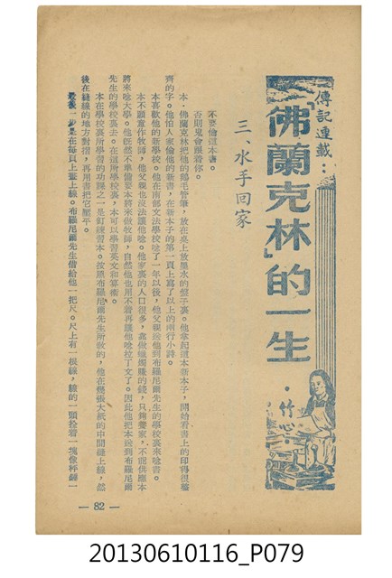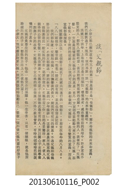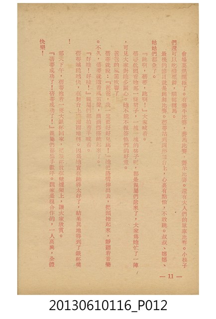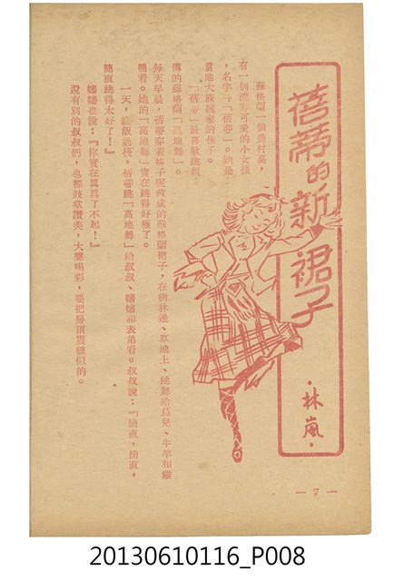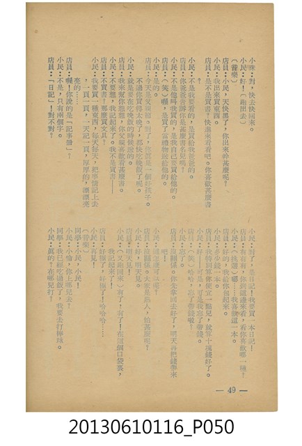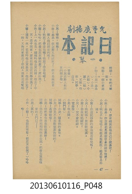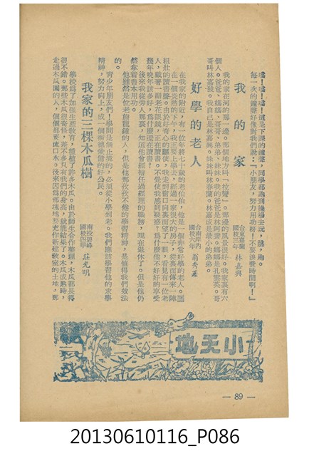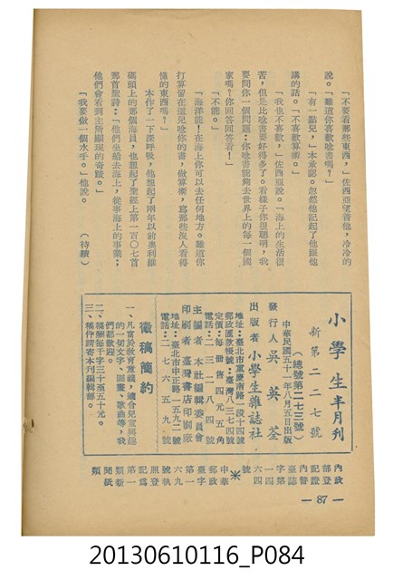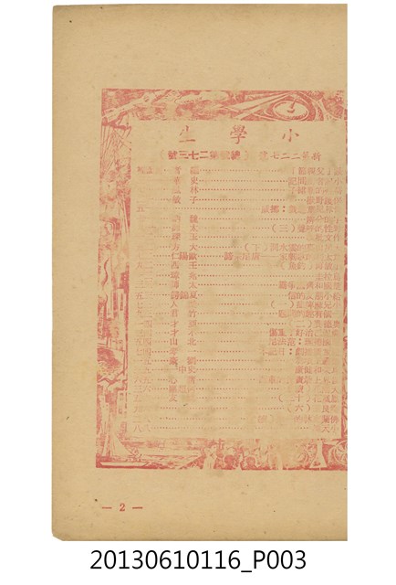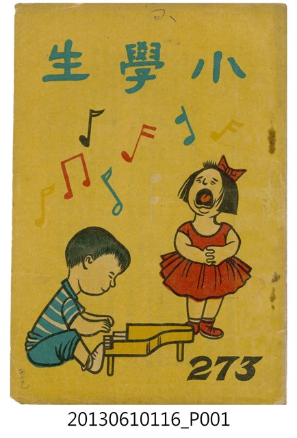 《小學生》由臺灣省政府教育廳於1951年3月20日創刊,採半月刊形式,每月5日、20日為發行日,至1966年停刊。內容包含童話、故事、小說、語文學習、科學、常識、史地、圖畫、兒歌、人物介紹、新書介紹,等各類專欄,也有提供兒童創作的「小天地」。紀錄了1950、1960年代部分社會情狀以及兒童生活。館藏自1957年9月到1966年6月間之《小學生》,計127冊(本案125件,另有館藏2013.014.0003、2013.014.0004等2件),約佔總刊數394之32%。均為32開本,採書訂包裝,封面為彩色印刷,內文為黑、藍、橘、紅間用之單色印刷。於1961年8月以前每期64頁,每本2.5元;自1961年9月起每期96頁,每本4.5元。本件為小學生雜誌社出版《小學生》273號(新第227號)。封面為一個談著鋼琴、一個張口唱歌的小朋友圖繪。內容有〈楚國和齊國爭霸〉、〈義國總理:范法尼〉、〈楚霸王項羽〉、〈佛蘭克林的一生〉等人物傳記、歷史故事及其他文章。封底為用架子搬運木頭、以及在樹下看書的鄉下小朋友攝影。