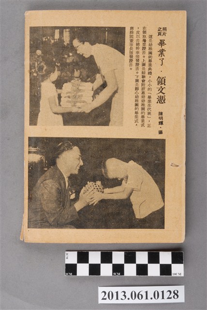 《小學生》由臺灣省政府教育廳於1951年3月20日創刊,採半月刊形式,每月5日、20日為發行日,至1966年停刊。內容包含童話、故事、小說、語文學習、科學、常識、史地、圖畫、兒歌、人物介紹、新書介紹,等各類專欄,也有提供兒童創作的「小天地」。紀錄了1950、1960年代部分社會情狀以及兒童生活。館藏自1957年9月到1966年6月間之《小學生》,計127冊(本案125件,另有館藏2013.014.0003、2013.014.0004等2件),約佔總刊數394之32%。均為32開本,採書訂包裝,封面為彩色印刷,內文為黑、藍、橘、紅間用之單色印刷。於1961年8月以前每期64頁,每本2.5元;自1961年9月起每期96頁,每本4.5元。本件為小學生雜誌社出版《小學生》297號(新第251號)。封面為有客廳、房間等設計的房屋圖繪。內容有〈美國新任駐華大使:賴特〉、〈音樂家的故事:拉赫曼尼羅夫〉、〈楚國聯越制吳〉、〈王祥和王覽〉等人物傳記、歷史故事及其他文章。封底為幼稚園畢業典禮的攝影。