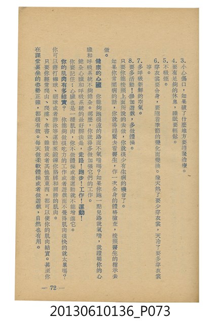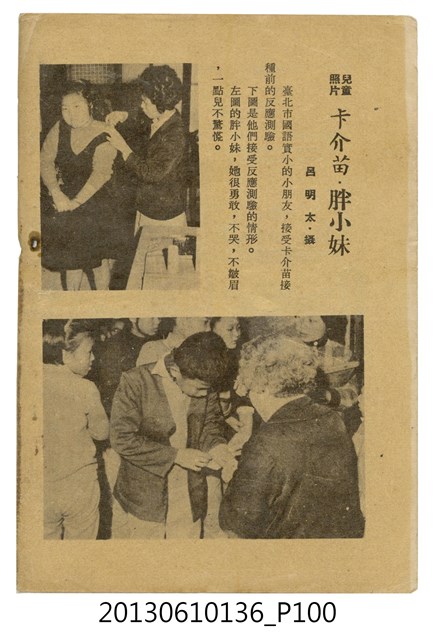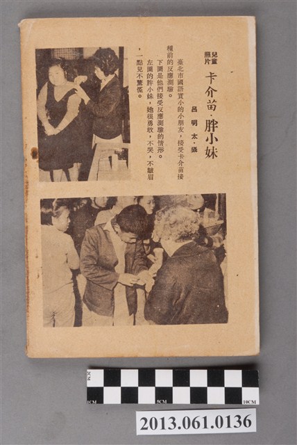 《小學生》由臺灣省政府教育廳於1951年3月20日創刊,採半月刊形式,每月5日、20日為發行日,至1966年停刊。內容包含童話、故事、小說、語文學習、科學、常識、史地、圖畫、兒歌、人物介紹、新書介紹,等各類專欄,也有提供兒童創作的「小天地」。紀錄了1950、1960年代部分社會情狀以及兒童生活。館藏自1957年9月到1966年6月間之《小學生》,計127冊(本案125件,另有館藏2013.014.0003、2013.014.0004等2件),約佔總刊數394之32%。均為32開本,採書訂包裝,封面為彩色印刷,內文為黑、藍、橘、紅間用之單色印刷。於1961年8月以前每期64頁,每本2.5元;自1961年9月起每期96頁,每本4.5元。本件為小學生雜誌社出版《小學生》309號(新第263號)。封面近景為一棵樹及爬上了樹的黑貓,遠景則是三棟煙囪冒著煙的房屋圖繪。內容有〈漢武帝的偉大建設〉、〈越王勾踐成為霸王〉、〈比利時王后─費比奧拉〉等人物傳記、歷史故事及其他文章。封底為小朋友接受卡介苗接種反應測驗、以及接種的攝影。