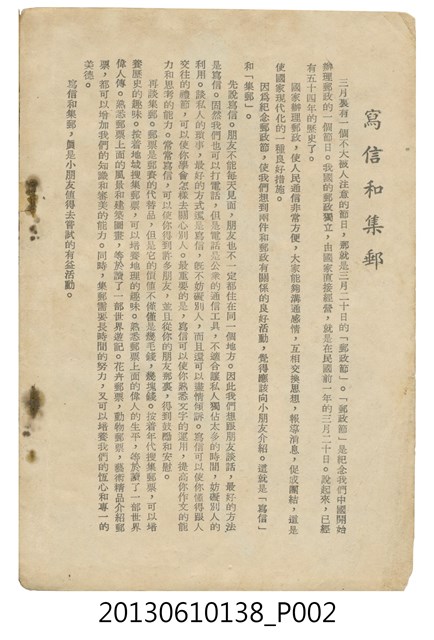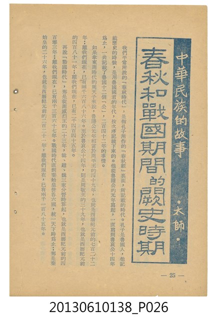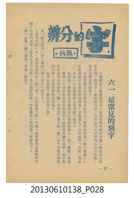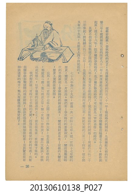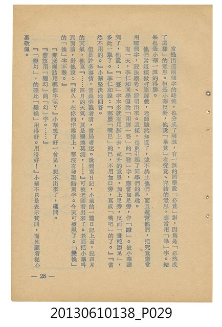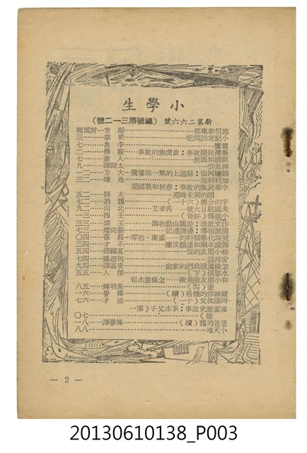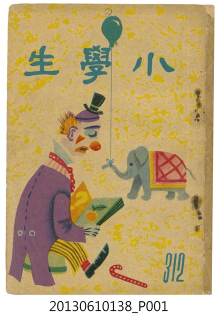 《小學生》由臺灣省政府教育廳於1951年3月20日創刊,採半月刊形式,每月5日、20日為發行日,至1966年停刊。內容包含童話、故事、小說、語文學習、科學、常識、史地、圖畫、兒歌、人物介紹、新書介紹,等各類專欄,也有提供兒童創作的「小天地」。紀錄了1950、1960年代部分社會情狀以及兒童生活。館藏自1957年9月到1966年6月間之《小學生》,計127冊(本案125件,另有館藏2013.014.0003、2013.014.0004等2件),約佔總刊數394之32%。均為32開本,採書訂包裝,封面為彩色印刷,內文為黑、藍、橘、紅間用之單色印刷。於1961年8月以前每期64頁,每本2.5元;自1961年9月起每期96頁,每本4.5元。本件為小學生雜誌社出版《小學生》312號(新第266號)。封面看著書的小丑以及鼻子上綁著氣球的大象圖繪。內容有〈黃虎旗的故事〉、〈春秋和戰國期間的闕史時期〉、〈發現化學顏料的─威廉‧拍琴〉、〈李冰父子〉等人物傳記、歷史故事及其他文章。封底為小朋友參加國語日報舉辦的看圖書畫比賽、以及省立臺北圖書館舉辦的作文比賽攝影。