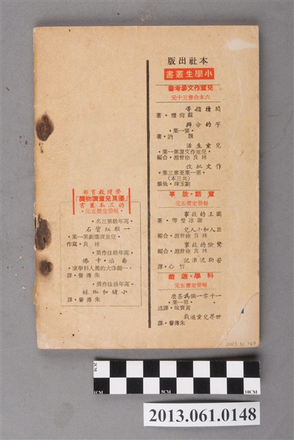 《小學生》由臺灣省政府教育廳於1951年3月20日創刊,採半月刊形式,每月5日、20日為發行日,至1966年停刊。內容包含童話、故事、小說、語文學習、科學、常識、史地、圖畫、兒歌、人物介紹、新書介紹,等各類專欄,也有提供兒童創作的「小天地」。紀錄了1950、1960年代部分社會情狀以及兒童生活。館藏自1957年9月到1966年6月間之《小學生》,計127冊(本案125件,另有館藏2013.014.0003、2013.014.0004等2件),約佔總刊數394之32%。均為32開本,採書訂包裝,封面為彩色印刷,內文為黑、藍、橘、紅間用之單色印刷。於1961年8月以前每期64頁,每本2.5元;自1961年9月起每期96頁,每本4.5元。本件為小學生雜誌社出版《小學生》323號(新第277號)。封面為兩個人坐在紅色的汽車中,正與站在人行道上的朋友交談著的圖繪。內容有〈春秋以前的武士教育〉、〈顏雲年和仙公〉、〈越南新任駐華大使─范春沼〉等人物傳記、歷史故事及其他文章。封底為小學生叢書的訂購宣傳。