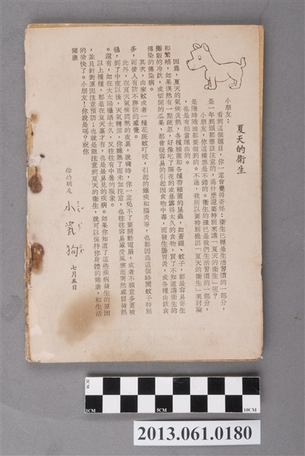 《小學生》由臺灣省政府教育廳於1951年3月20日創刊,採半月刊形式,每月5日、20日為發行日,至1966年停刊。內容包含童話、故事、小說、語文學習、科學、常識、史地、圖畫、兒歌、人物介紹、新書介紹,等各類專欄,也有提供兒童創作的「小天地」。紀錄了1950、1960年代部分社會情狀以及兒童生活。館藏自1957年9月到1966年6月間之《小學生》,計127冊(本案125件,另有館藏2013.014.0003、2013.014.0004等2件),約佔總刊數394之32%。均為32開本,採書訂包裝,封面為彩色印刷,內文為黑、藍、橘、紅間用之單色印刷。於1961年8月以前每期64頁,每本2.5元;自1961年9月起每期96頁,每本4.5元。本件為小學生雜誌社出版《小學生》366號(新第320號)。封面為色塊組成的魚圖繪。內容有〈小貓咪的花開了〉、〈傑出的科學家:哥白尼〉、〈須賈又見到范雎〉等人物傳記、歷史故事及其他文章。封底為火箭和噴射機的彩色圖片,並沾黏上367號(新第321號)之封面。