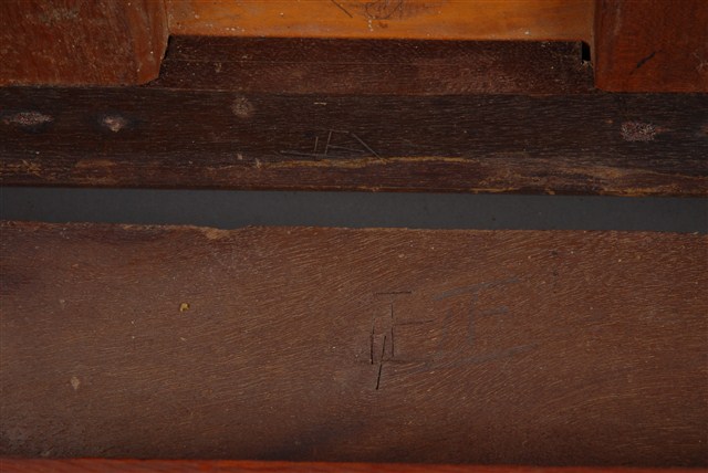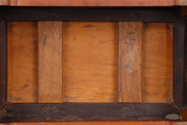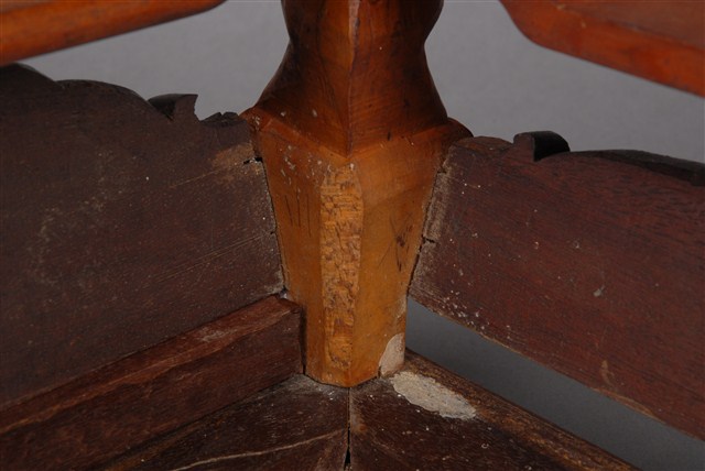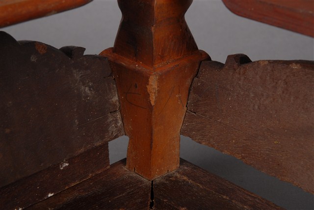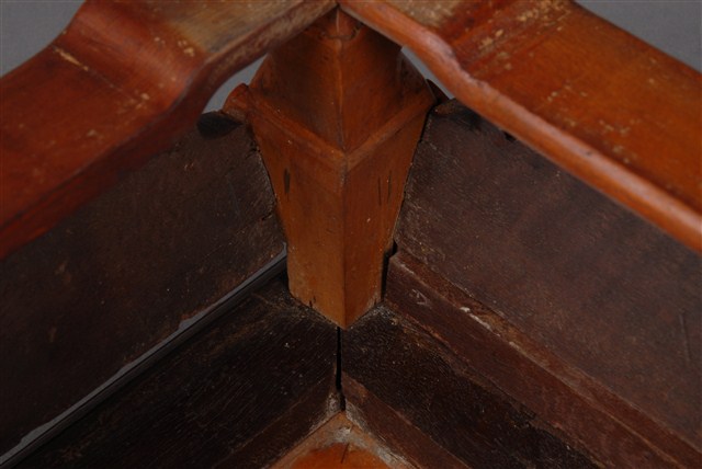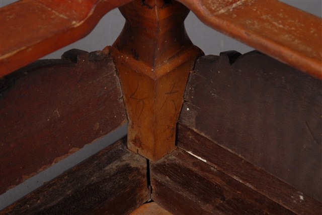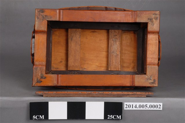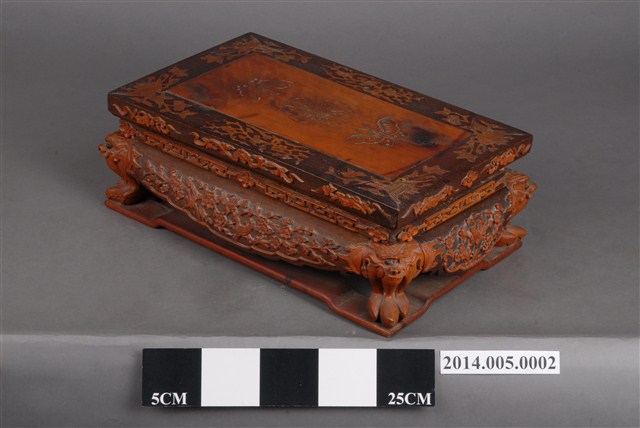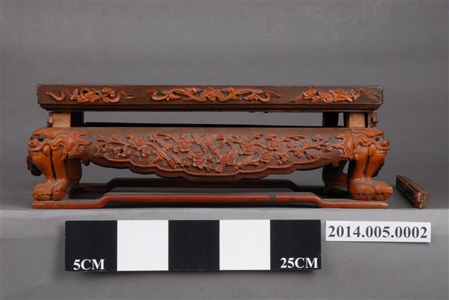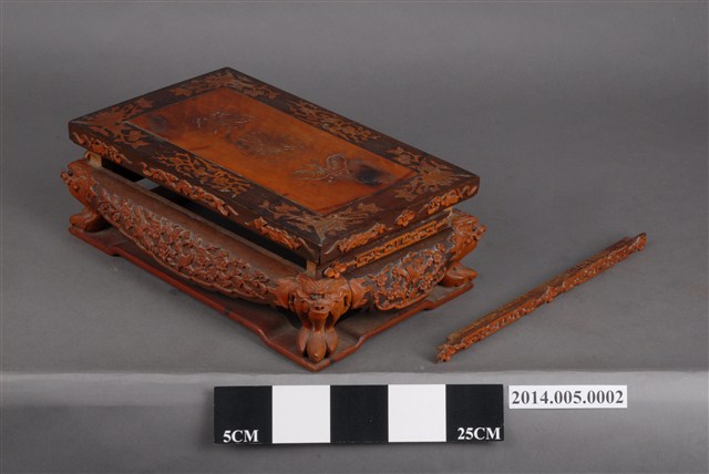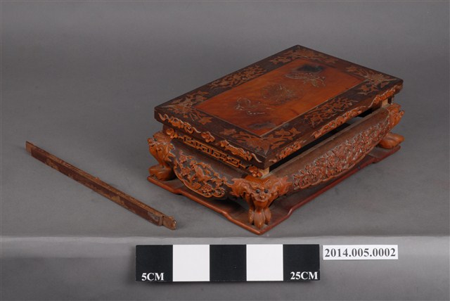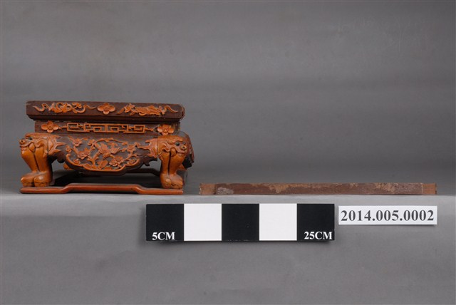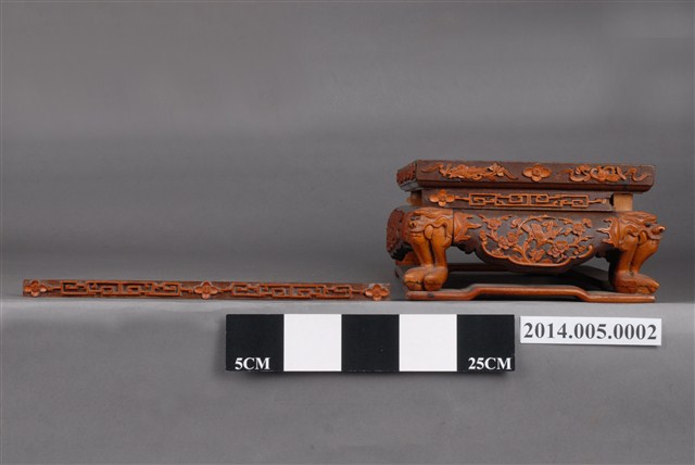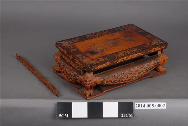 宣爐几,為中小型桌上擺設物件,構造與神桌相仿,唯體制較為方正低矮,其上主要放置小件香爐及相關用具,故稱「宣爐几」或「檀爐座」,亦有放置奇木雅石等珍玩或者小型神像者。本件宣爐几為木製品,作四腳方形體,獸足,束腰,帶拖泥、牙條。全件運用深淺兩色木料,深色為底、以淺色料雕造紋飾鑲入,呈現二色相間的視覺效果,為臺南體式傳統傢俱擅用之「異木鑲嵌」技法(慣稱「茄冬入石」)。另本件紋飾題材較為典雅,牙條雕造「喜上眉梢」,腰部以連續回紋與花紋相接延綿,頂部側面雕造蓮花芭蕉(連招)、蓮花磬牌(連慶)複合紋飾及蝙蝠、花卉單一紋飾,頂面外圍作深色底,異木鑲入「一路連科」、「喜上眉梢」複合紋飾,內層為淺色底線雕中間的菊花及左右蝴蝶紋飾各一。