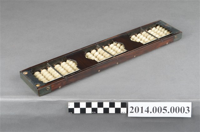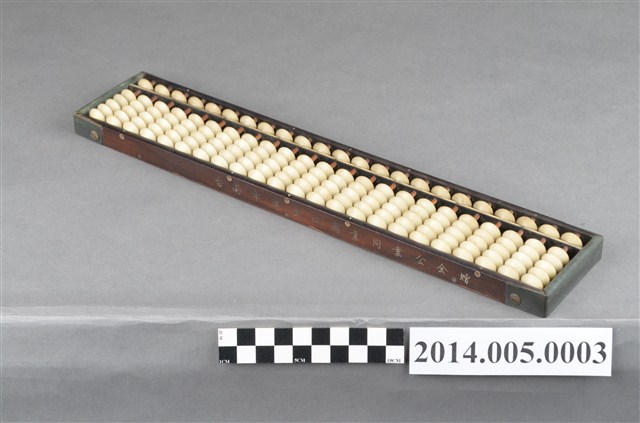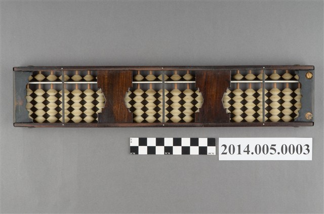 本件算盤主要為木造,輔金屬材質加固結構。型制作23檔、一五珠式,一五珠算盤為十進位式算盤,為中國明朝社會算盤的主流式樣之一種,故又稱為「明式算盤」。本件木框內緣浮貼「自強牌」標籤,應為算盤製造商標籤,製造商全名「自強文具工廠實業股份有限公司」,創立於民國52年(1963年)8月,以生產文書事務類用品為主,算盤則為該公司主流生產項目之一種。
