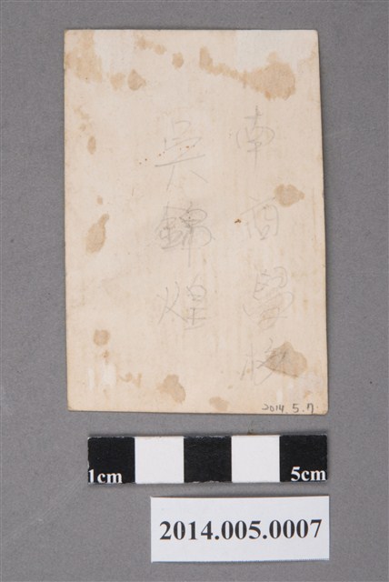 本張照片為吳錦煌先生於就讀台南專修學校時期,因應學校軍事訓練教育課程,穿著訓練服所拍下的半身照。照片背面筆註「南商學校」、「吳錦煌」字樣。