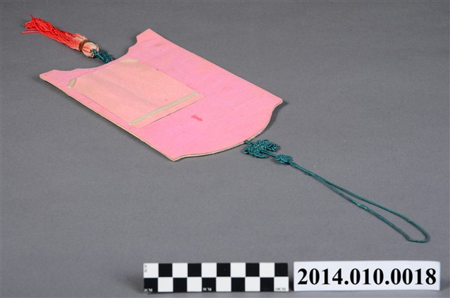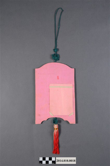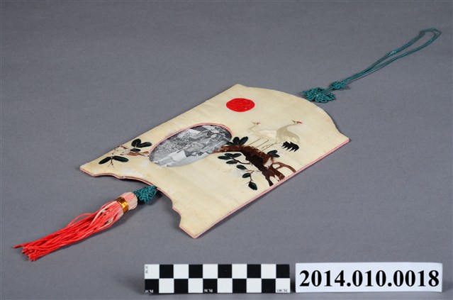 本件為日本時代藝妓致贈客人人像掛飾,表面略有破損,主體為藝妓的黑白人像。背面仍留有印章痕跡,上端與下端分有掛線與流蘇 。