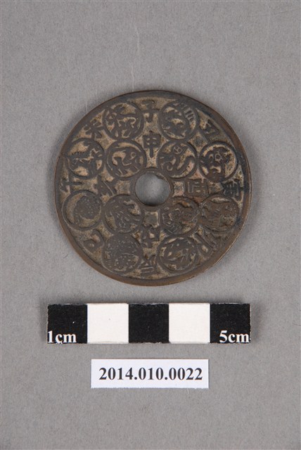 在民間習俗中錢幣具有避邪之效,本錢幣兩面鐫有:「天干地支」;「敕令」等字樣。