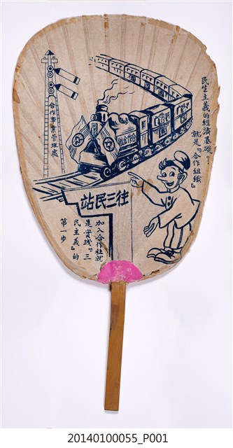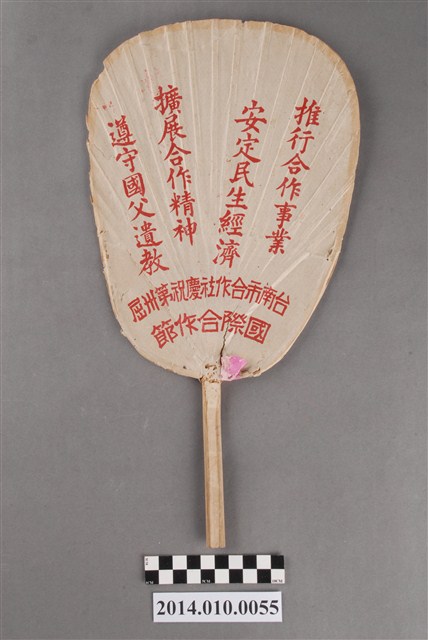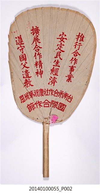 台南市合作社扇子為慶祝國際合作節致贈之紀念扇子,扇面寫有:「民生主義的經濟基礎?就是『合作組織』」、「加入合作社就是實踐『三民主義』的第一步」。