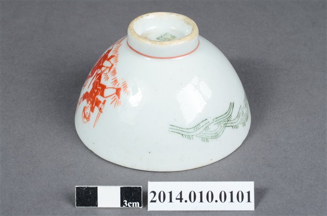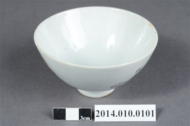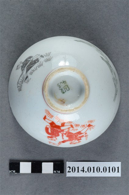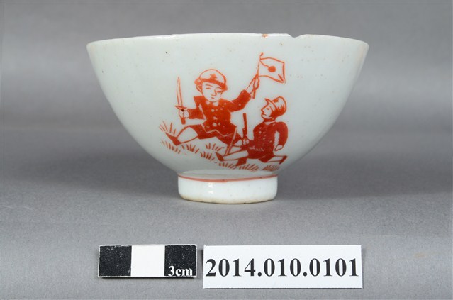 本件物件應為日本時代製作,上面彩繪2個穿著日本軍服的人,另一面以彩筆勾勒出山景。本件彩繪可作為日本時代戰爭宣傳的代表。雖然碗盤是日常生活使用的物件,但是碗盤上的彩繪圖案往往會因為時代變遷有所更迭,而本件的彩繪圖案正可反映出日本軍國主義宣傳。