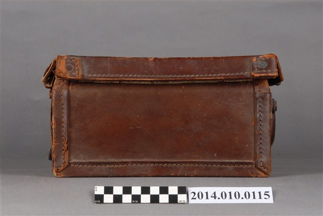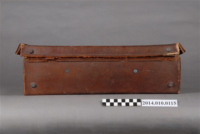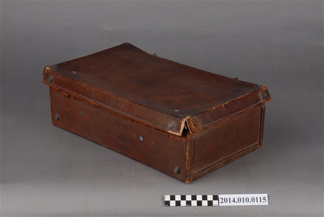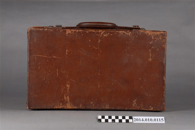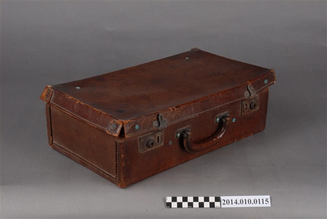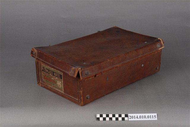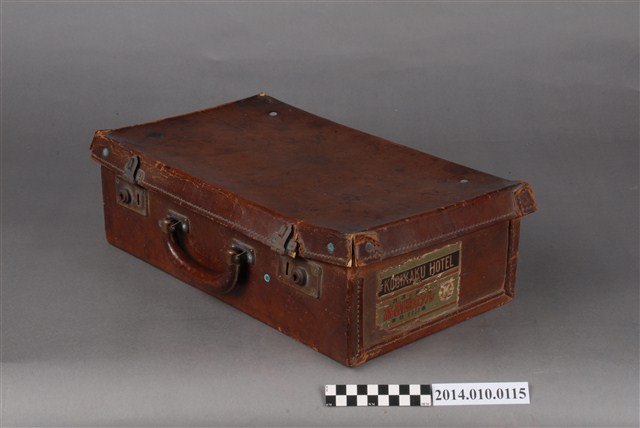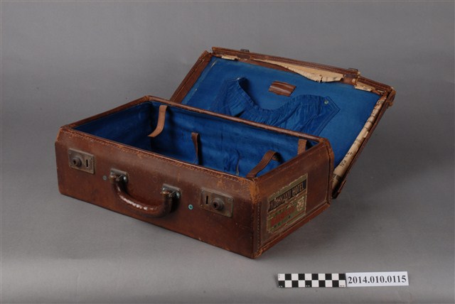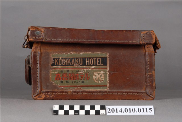 本件皮製行李箱為日本時代物件,內有藍色絨布,行李外部貼有紙質標籤,寫有:「台湾‧台北 高義閣ホテル KOGIKAKU HOTEL」等字樣。行李箱上的標籤是旅客投宿旅店時張貼的標籤,是行李箱主人的旅行紀錄。