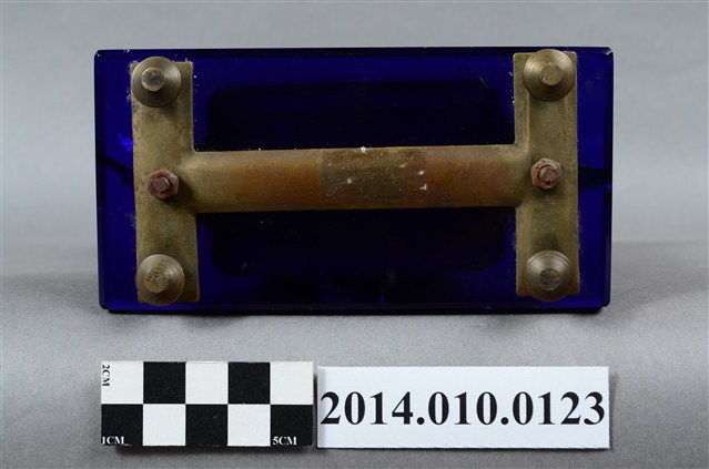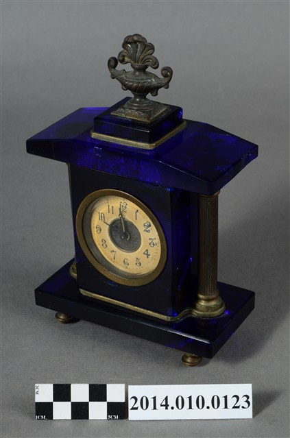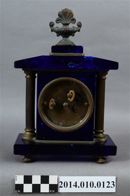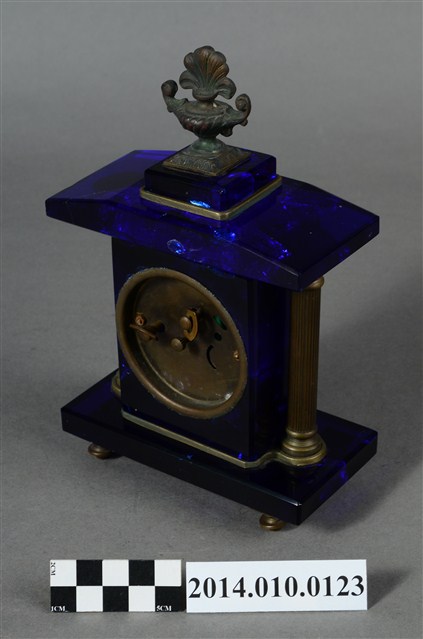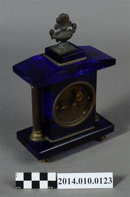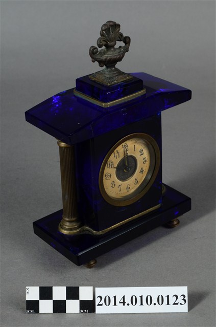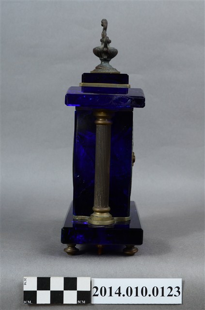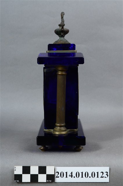 本件為玻璃製座鐘,玻璃部分呈現靛藍色澤,呈現出精巧的座鐘工藝。