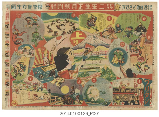 本件為日本《セウガク二年生》第10卷一3號(按:《小学二年生》雜誌)所附的漫畫双陸,彩色印刷,昭和10年(1935)發行,發行者為小學館。底圖是由12則故事作為經過點,故事主題包括「にいさんの入營」(譯:哥哥入伍)、「蛙」、「牛若丸」、「かけっこ」(翻譯:賽跑)、「かちっ山」(按:日本童話「かちかち山」)、「がくやひめ」(按:輝夜姬」)、「豆まき」(按:撒豆子,為日本立春前的驅邪儀式)、「たぬきのつづみ」(按:日本童話故事「狸貓腹鼓」)、「大江山」、「海軍のにいさん」、「蒲島太郎」、「百合若」(按:日本傳說人物)等。 雙陸(日語:すごろく),又作雙六,是一種古老的桌上遊戲,據傳由天竺傳入中國後,經過發展與變化後,逐漸傳播於日本、朝鮮等地區,在日本方面,根據玩法可區分為兩人遊戲(盤双六)與多人遊戲(繪双六),本物件屬於繪雙六。