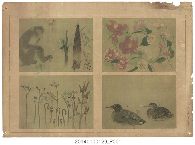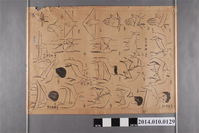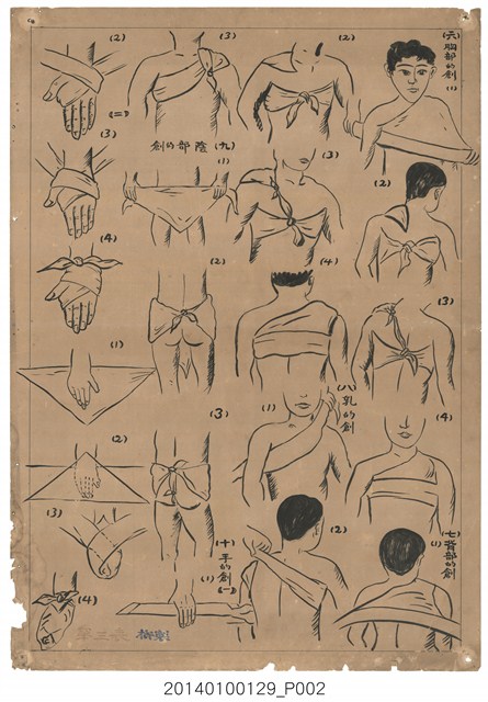 本件為教育掛圖,發行時間與發行者不詳,正面彩色印刷;反面黑白印刷,正面為四組動植物圖片;反面則是描繪各種部位的包紮方法,包括胸部、乳、背部、手、陰部等部位。