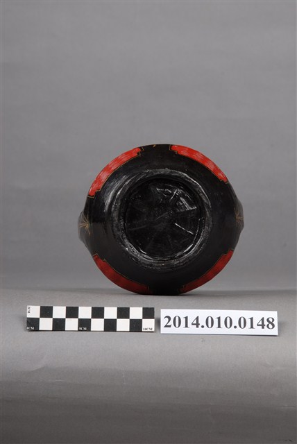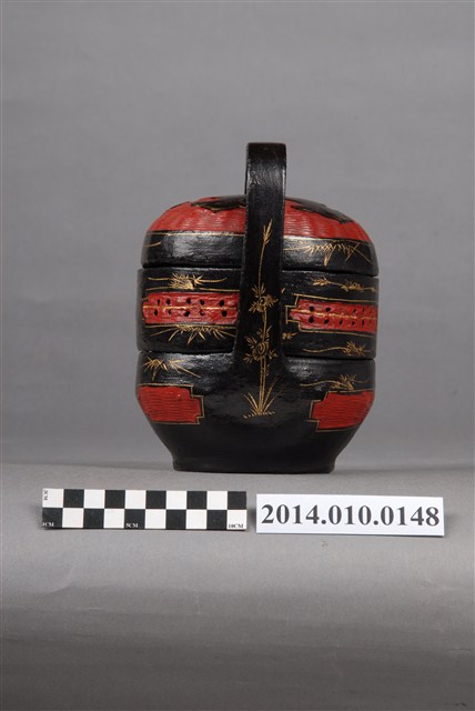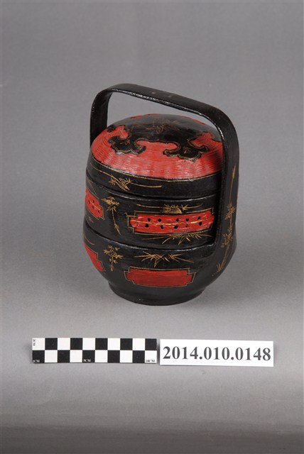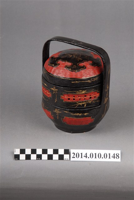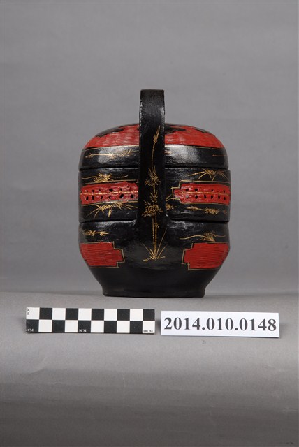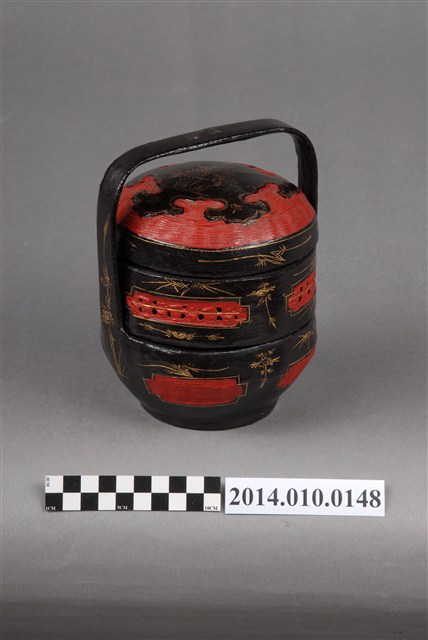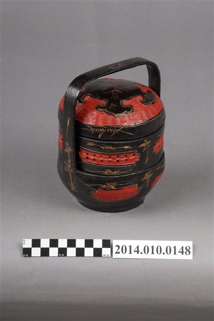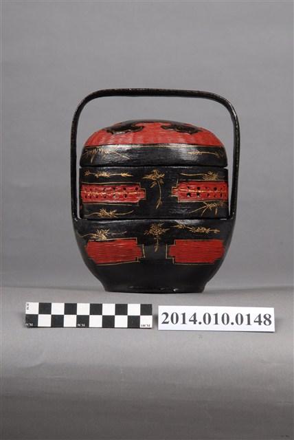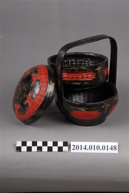 此一檳榔籃未有具體的使用場合及時間脈絡。籃身整體塗以黑漆,籃蓋及籃身塗有部分的橘紅色塊;並以金色線條勾勒簡單花草圖式,且留有細小的孔洞。檳榔籃係民間禮俗用品,為小型謝籃。