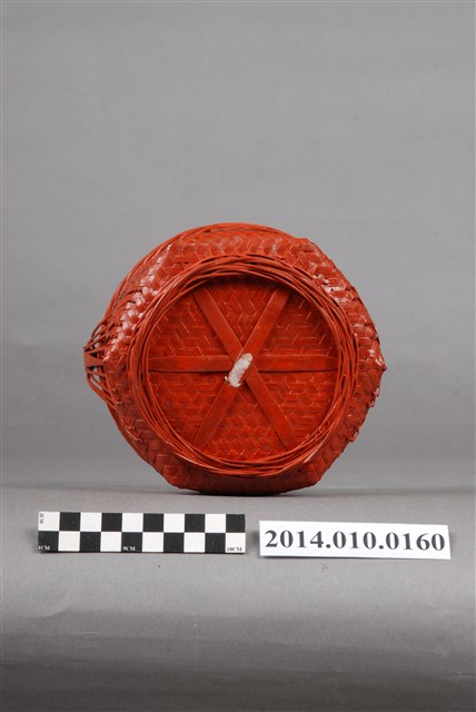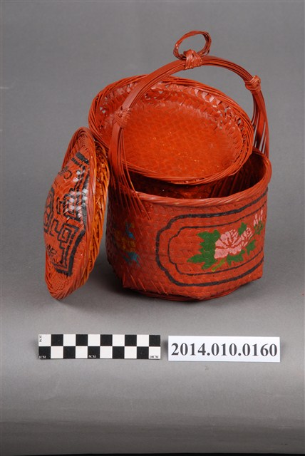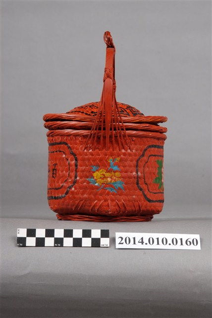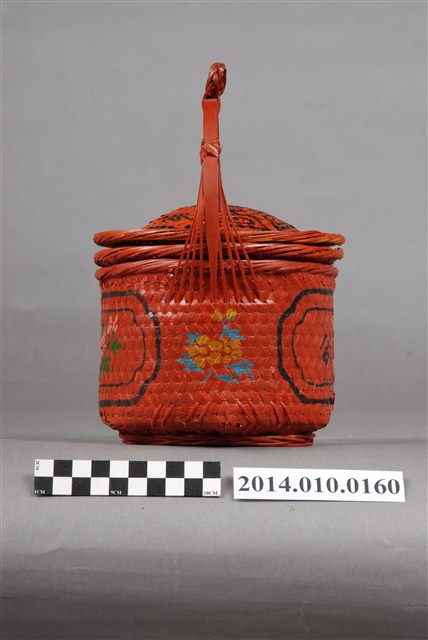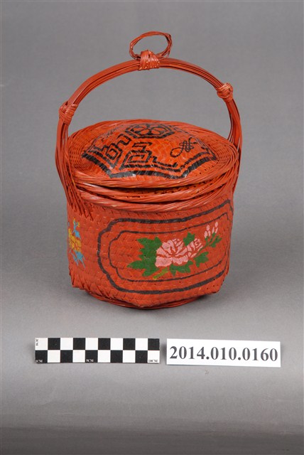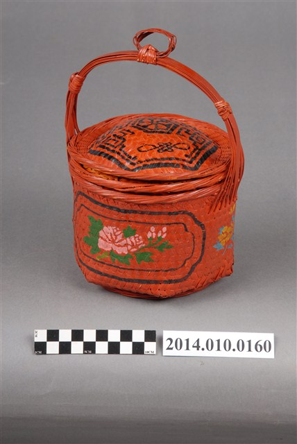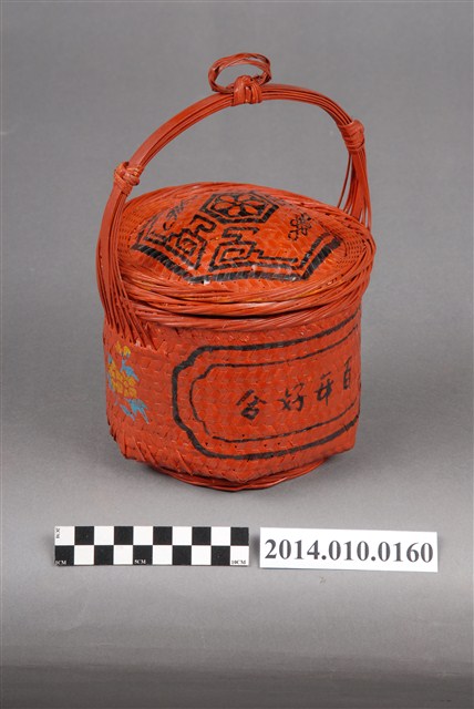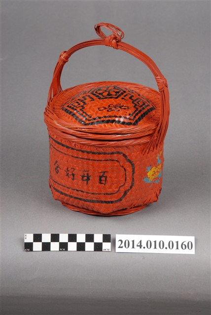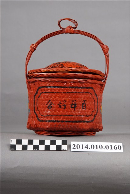 藤木片編織而成的檳榔籃,籃身寫有「百年好合」之字樣,推測應為婚禮禮俗用之物件。此物件與編號101056-0137之物件,有相似的形制及文字圖樣,惟籃身與文字的顏色皆相異。檳榔籃係民間禮俗用品,為小型的謝籃。
