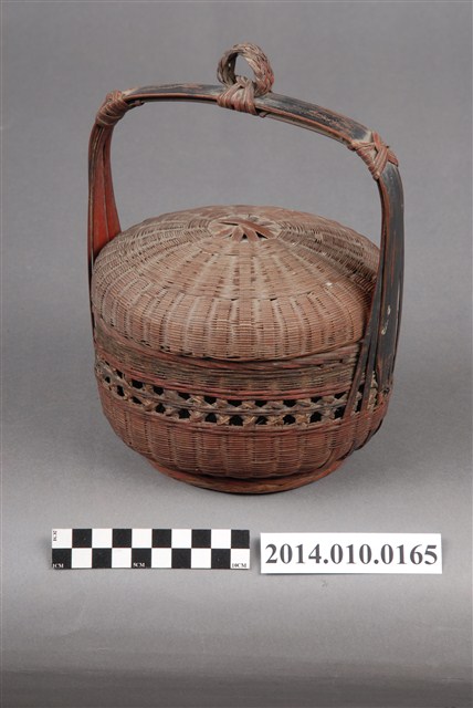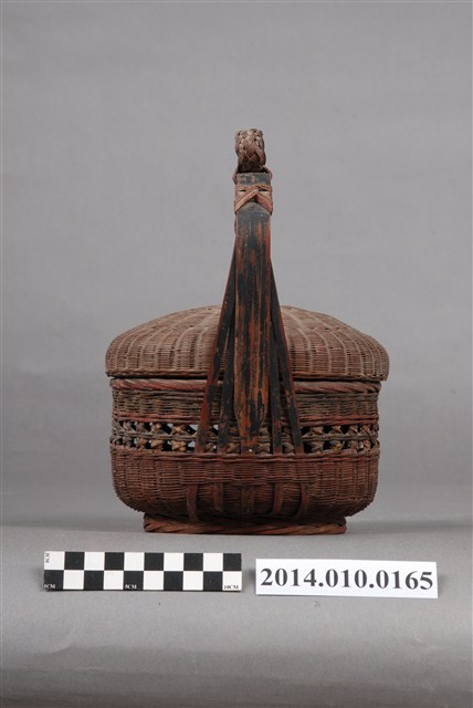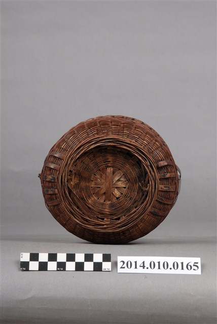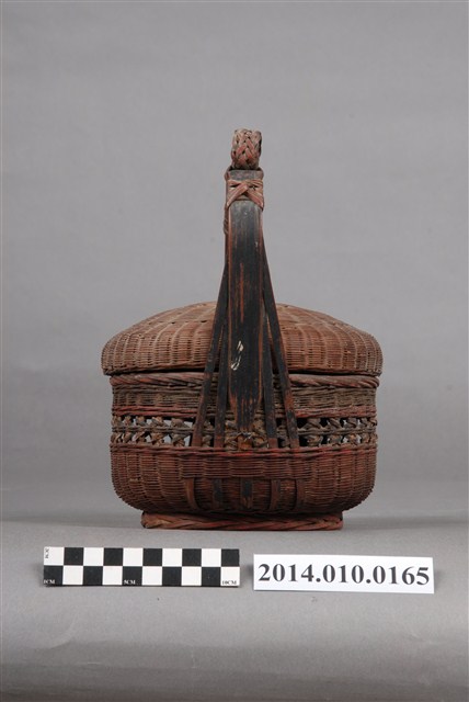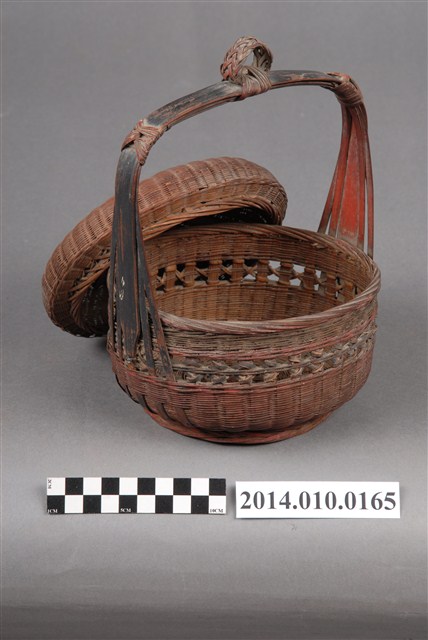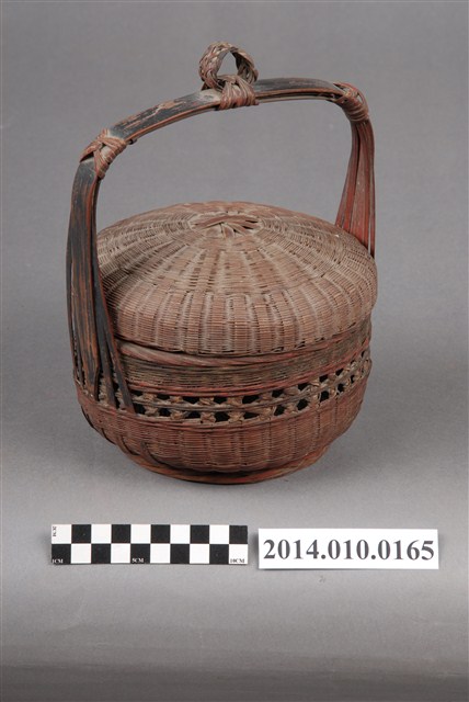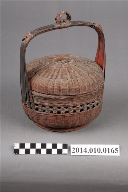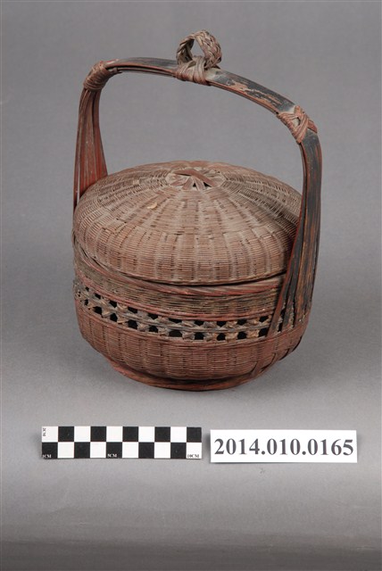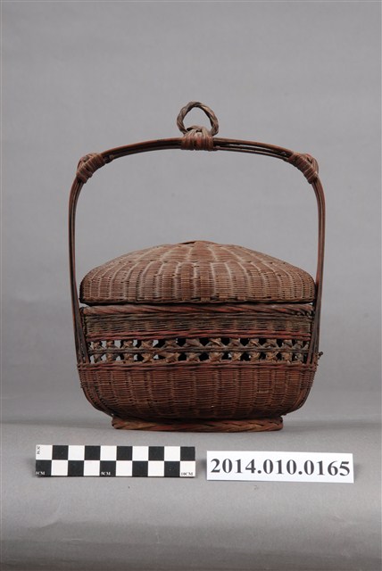 細藤木條編織而成的檳榔籃,籃身中段有相互對位、整齊排列的正五角形與倒五角形孔洞。此一物件未有具體的使用者及時間脈絡。檳榔籃係民間禮俗用品,為小型的謝籃。