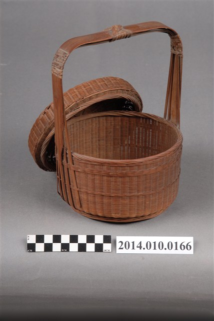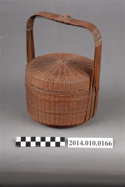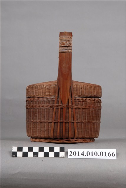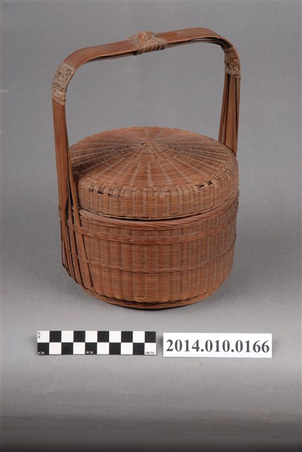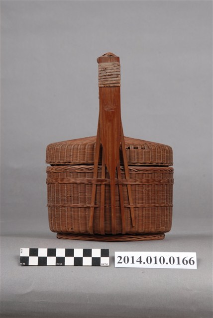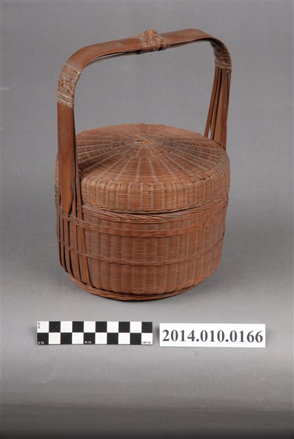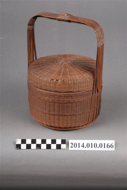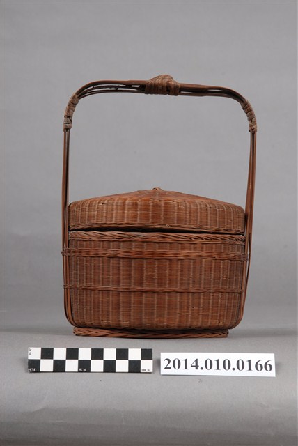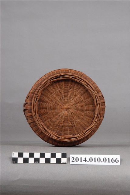 細藤木條編織而成的檳榔籃,未有具體的使用者及時間脈絡。檳榔籃係民間禮俗用品,為小型的謝籃。