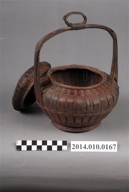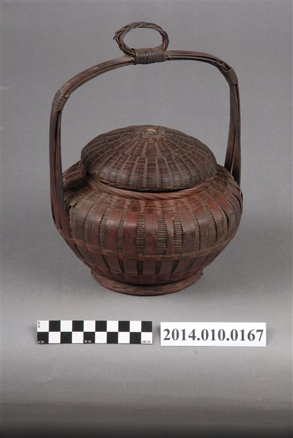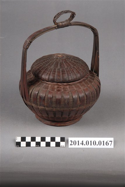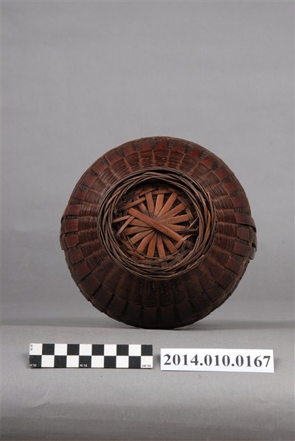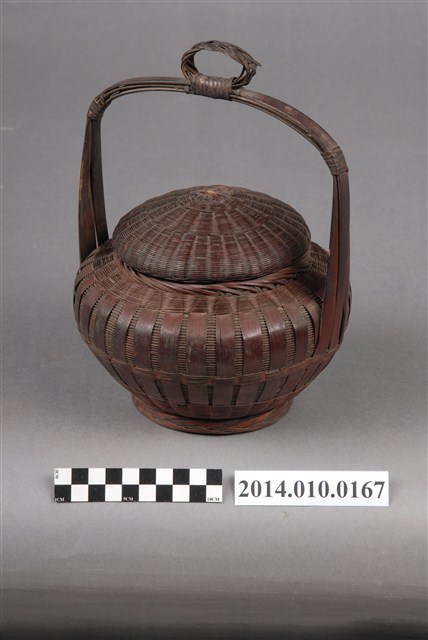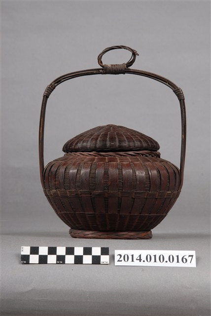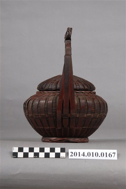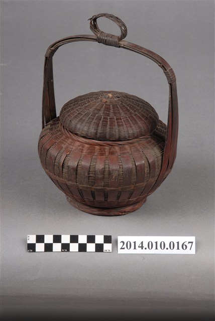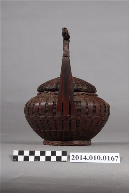 細藤木條編織而成的檳榔籃,籃身呈壺狀,整體為深褐漆;未有具體的使用者及時間脈絡。檳榔籃係民間禮俗用品,為小型的謝籃。