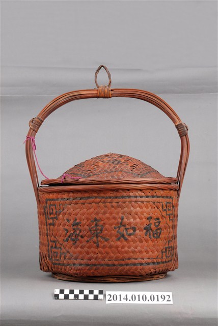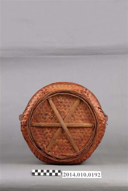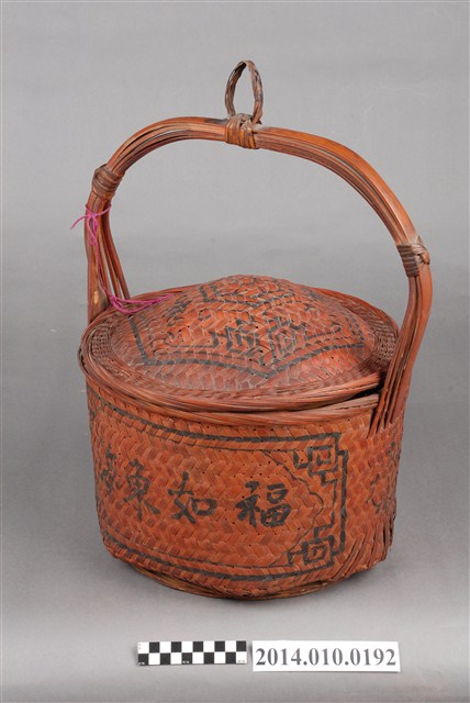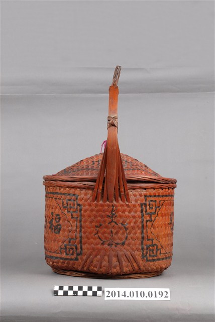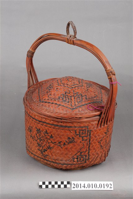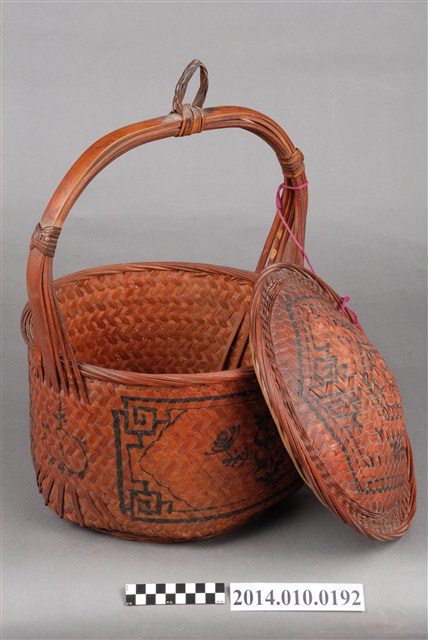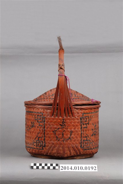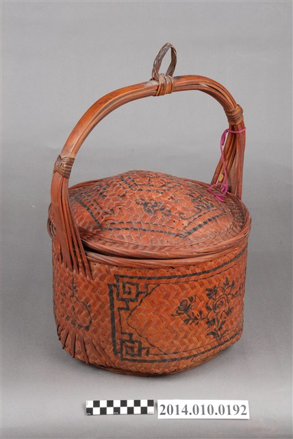 由藤木片及細藤木條編織而成的檳榔籃,籃身及籃蓋繪有簡約的花卉圖案。物件未有具體的使用者及時間脈絡。