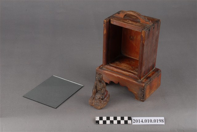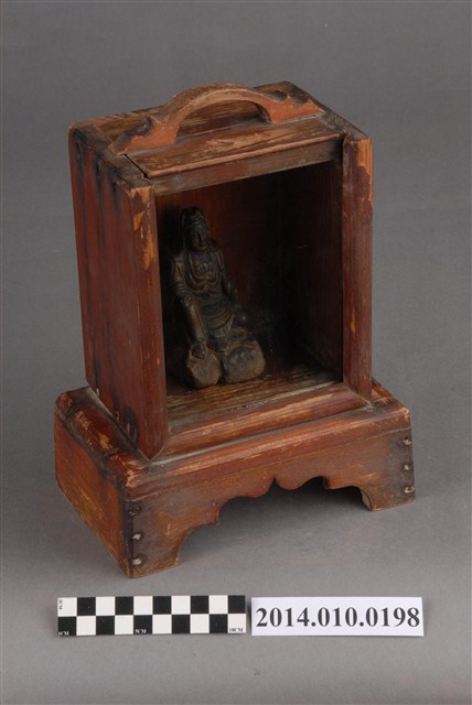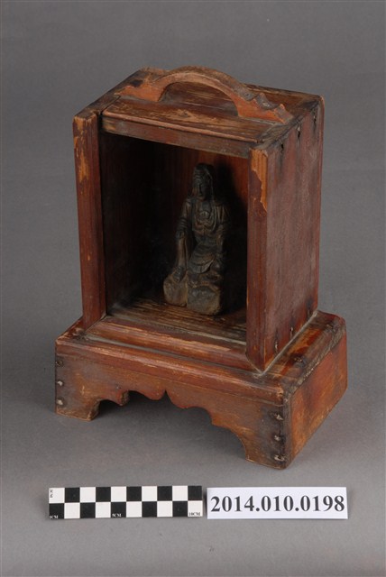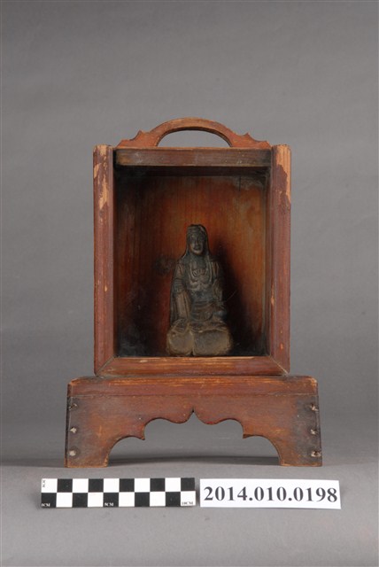 為恭奉神祇的神龕,未設有閣門,雕刻的觀音神像與神龕已分離。物件未有具體的時間及使用者脈絡。