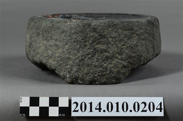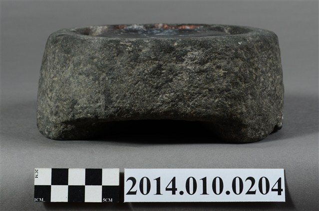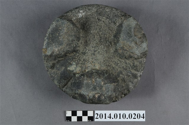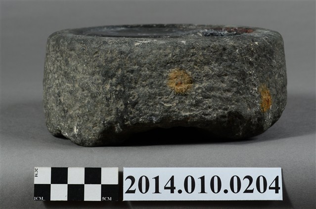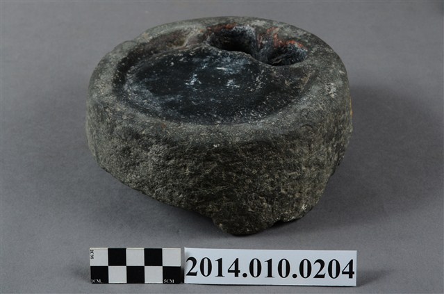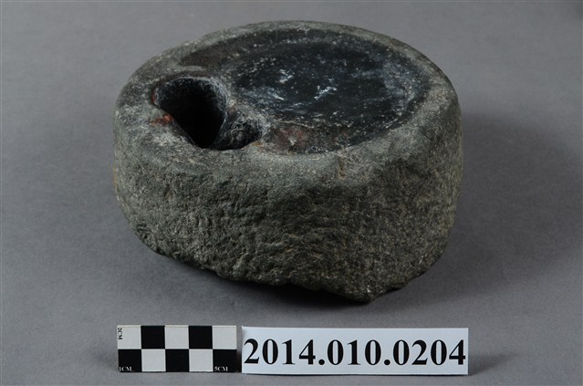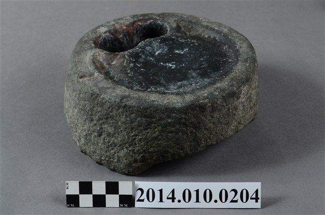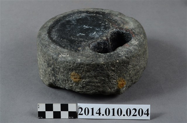 據收藏家洪輝龍所述,此為清朝的硯台,且出自台南神農街。為圓形硯台,內有兩並列的圓形凹洞。