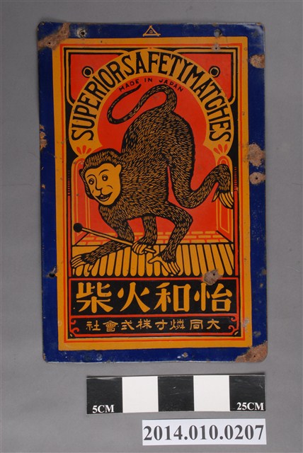 本件為怡和火柴的廣告招牌,為琺瑯材質,圖案、字體浮突,以猴手執火柴為主要招牌意象。除企業名稱外,亦寫有「SUPERIOR SAFETY MATCHES」、「MADE IN JAPAN」以及「大同燐寸株式會社」等字樣。