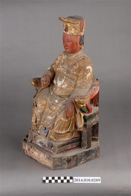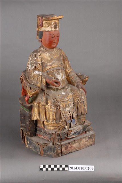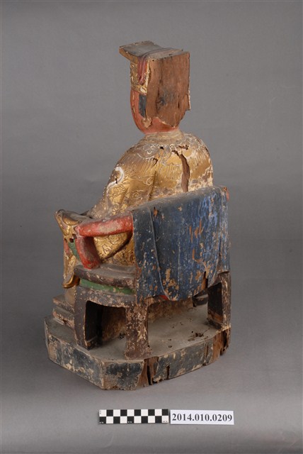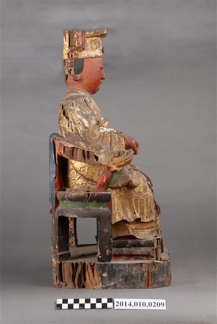 本件為木刻媽祖神像,臉部繪以紅彩,底座及衣飾部分有若干毀損處。館藏的媽祖神像(例館藏編號2003.008.0046、2003.008.0047、2003.008.0057、2003.008.0068、2003.008.0073、2003.008.0074等),未有相似之形制。據收藏家洪輝龍所述,為清代神像。缺乏具體的時間及使用者脈絡。