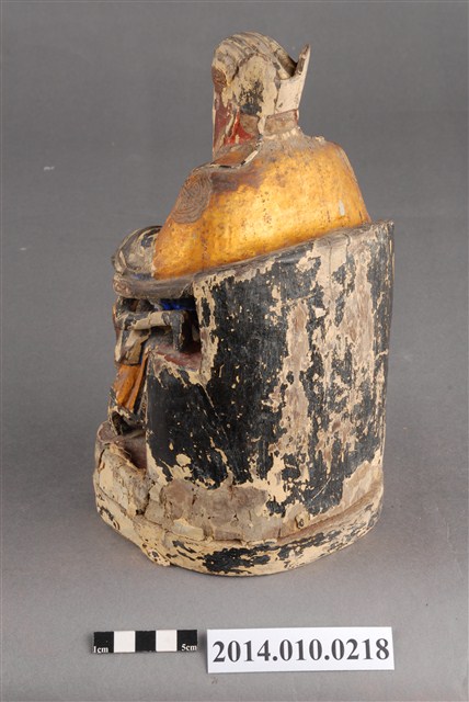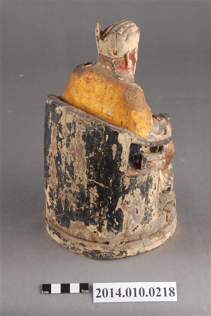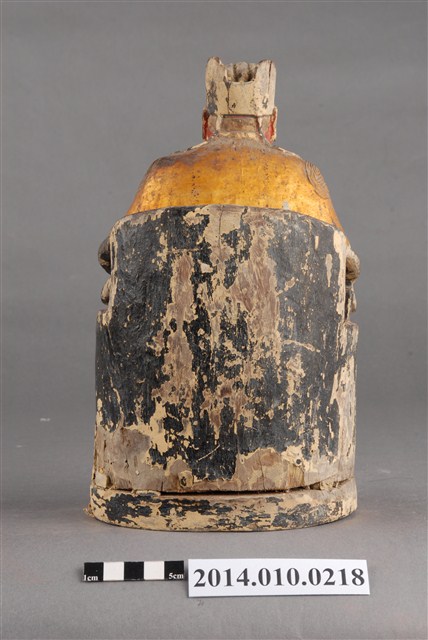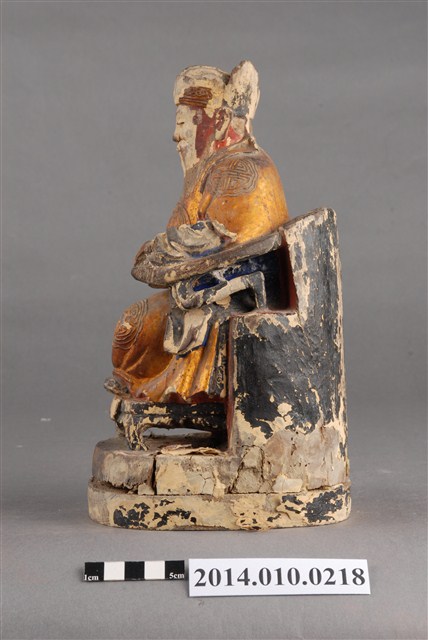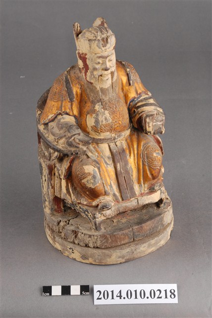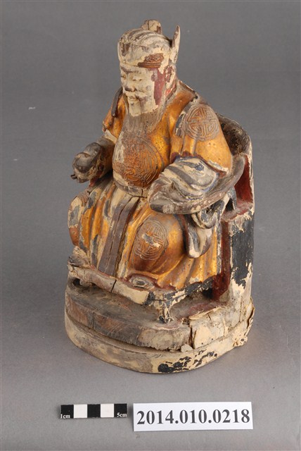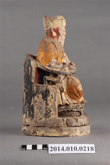 本件為木刻的土地公神像,呈坐姿,著有官服;物件原有上色,但多已剝落,現僅存部分的漆色痕跡。據收藏家洪輝龍所述,為清代至日本時期的神像,缺乏具體的時間及使用者脈絡。