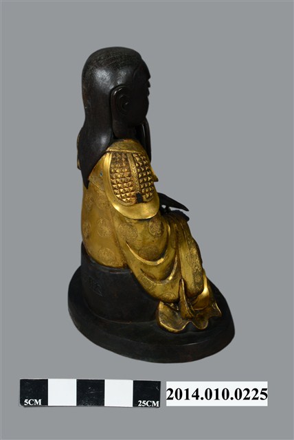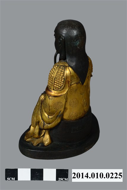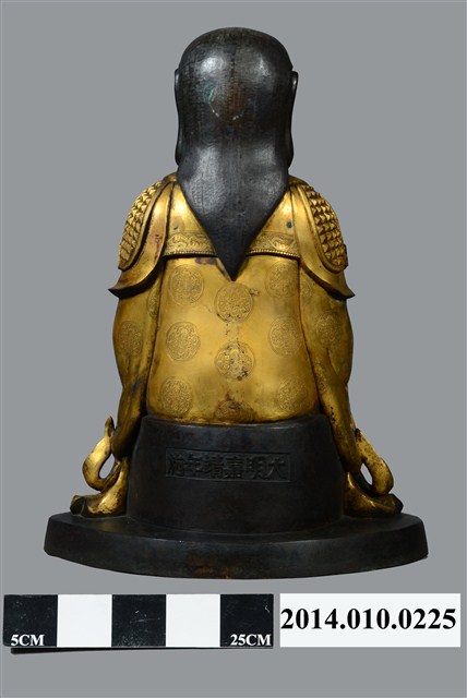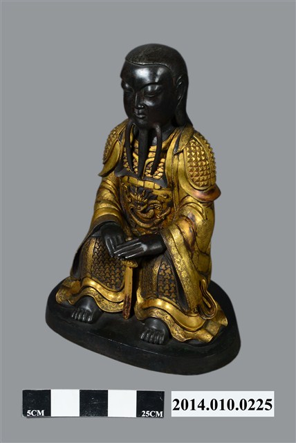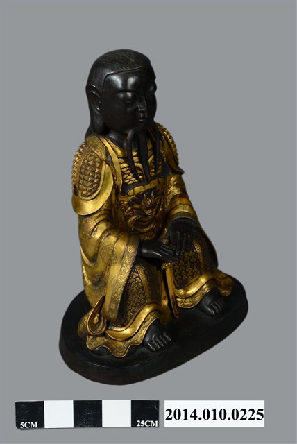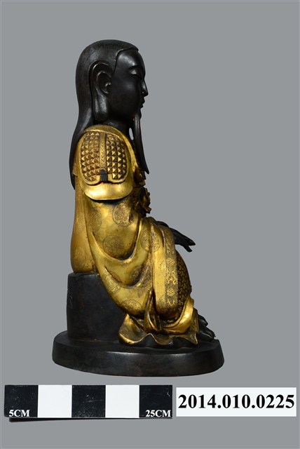 為琉金銅材質的玄天上帝神像,衣飾部分為黃金色,其餘則為黑銅色澤。物件的時間及使用者脈絡不明。本件神像造型與一般民間習俗中玄天上帝角踩龜與蛇的姿態不同。
